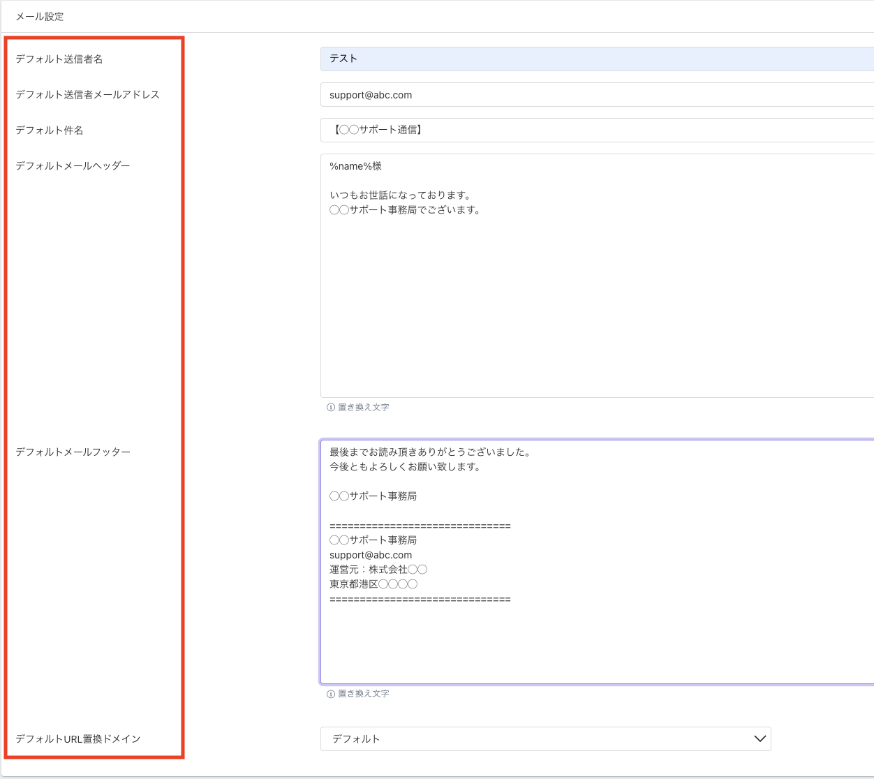 ・デフォルトメールフッダー:デフォルトで記載されるフッダー内容となります。