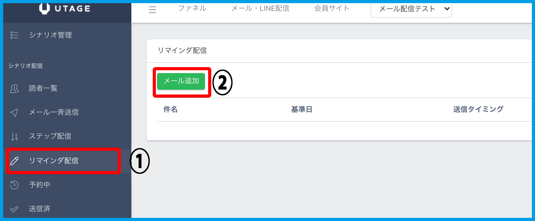 2.左メニュー【リマインダ配信】を開き【メール追加】をクリックします。