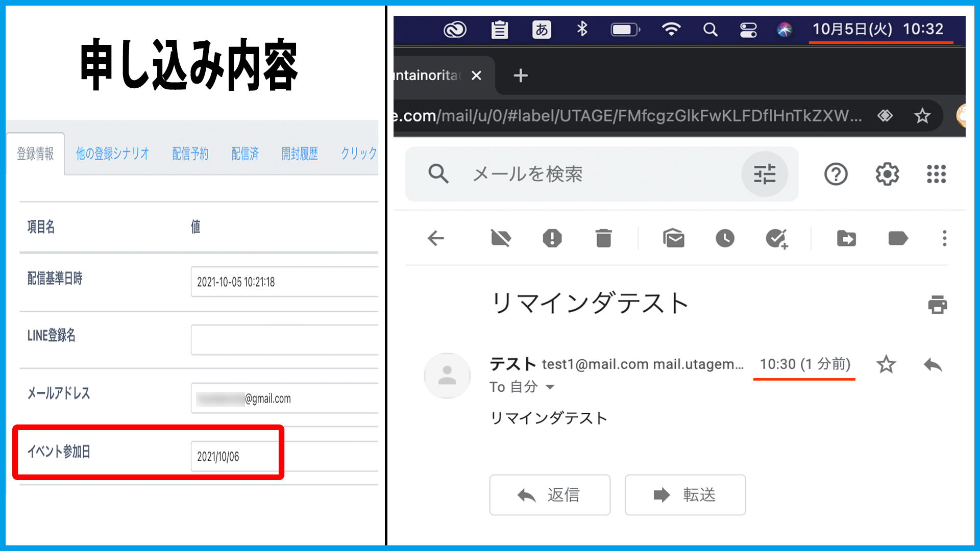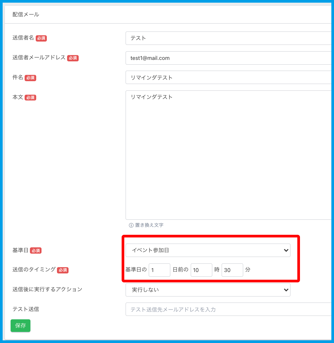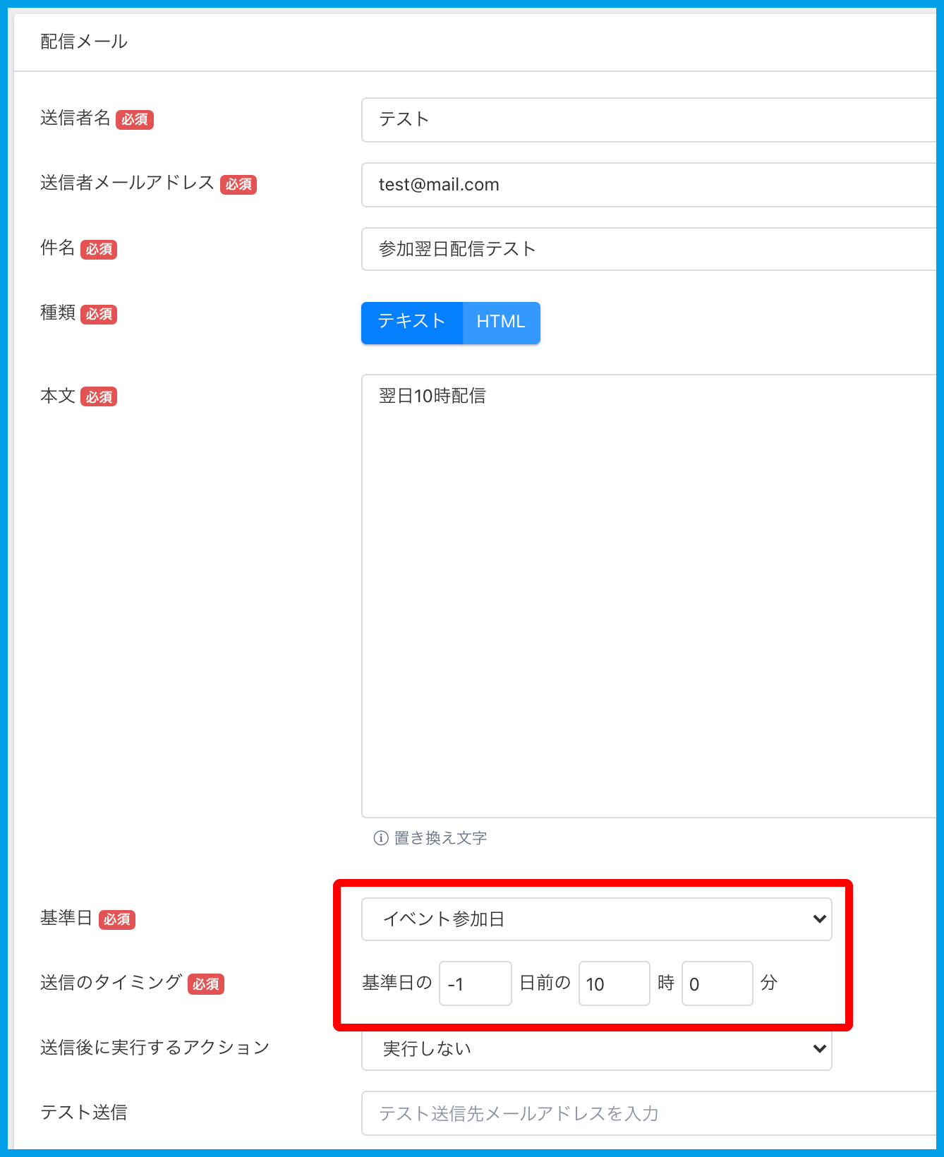 「送信のタイミング」で「【-1】日前」と設定すると、基準日の翌日に配信する設定も可能です。