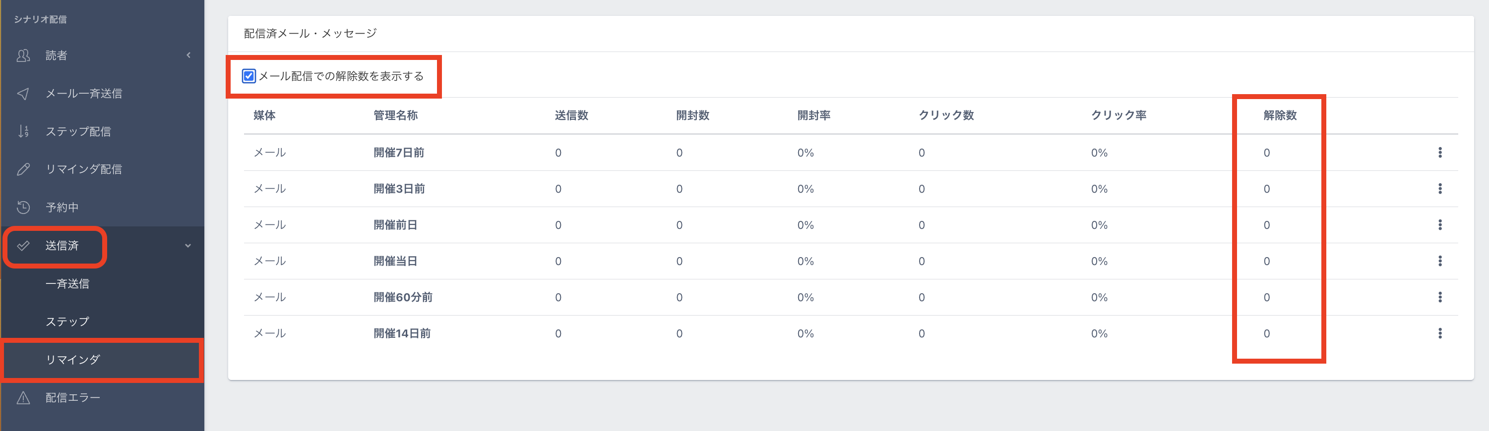 【送信済】>リマインダより、【メール配信での解除数を表示する】にチェックを入れると解除数が表示されます。