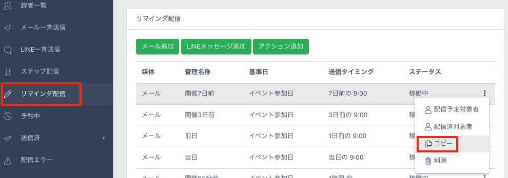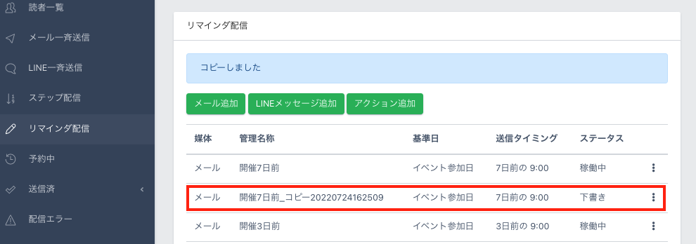 1.【リマインダ配信】より、コピーしたいメールの「⋮」のメニューから【コピー】をクリックします。