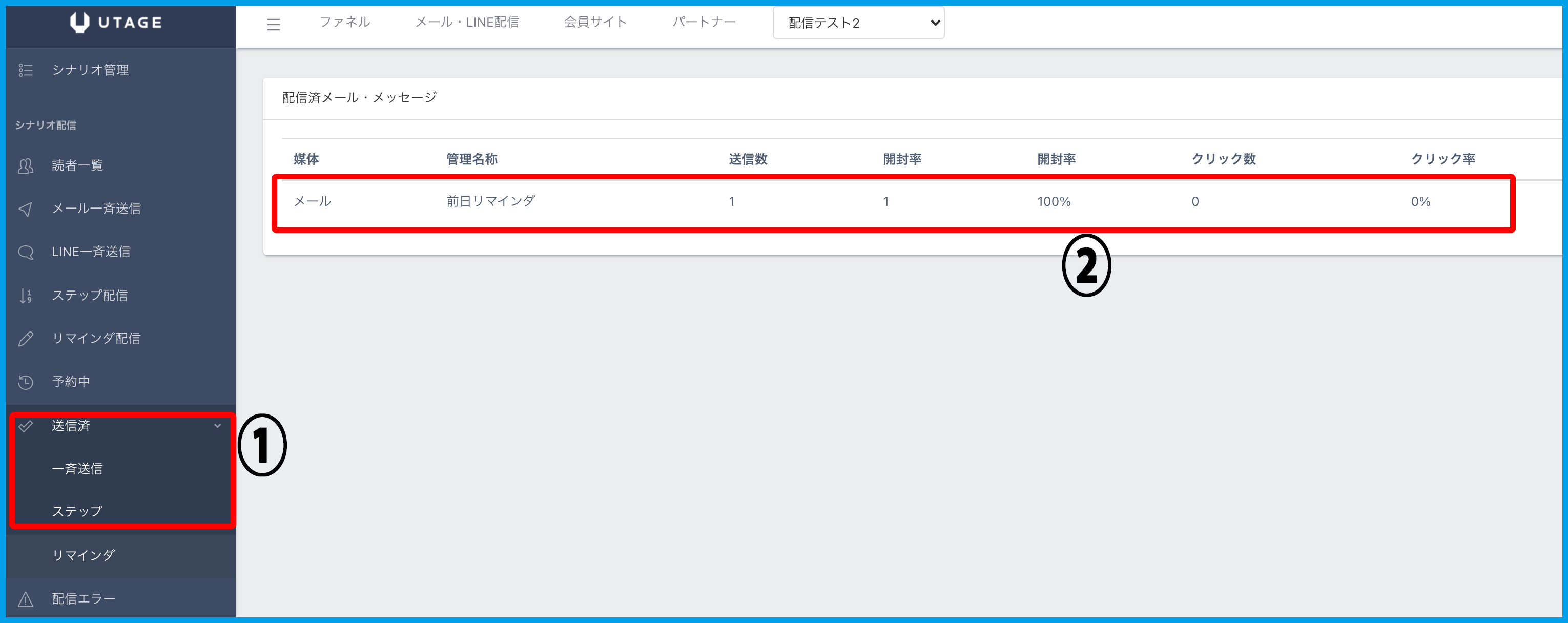 5..送信数や開封率は左メニュー【送信済】>【リマインダ】より確認できます。