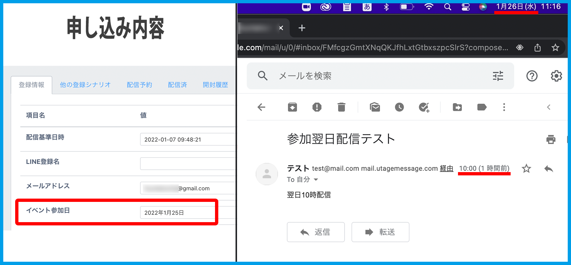 例)参加日:1月1日の場合、1月2日の指定時刻に配信されます。