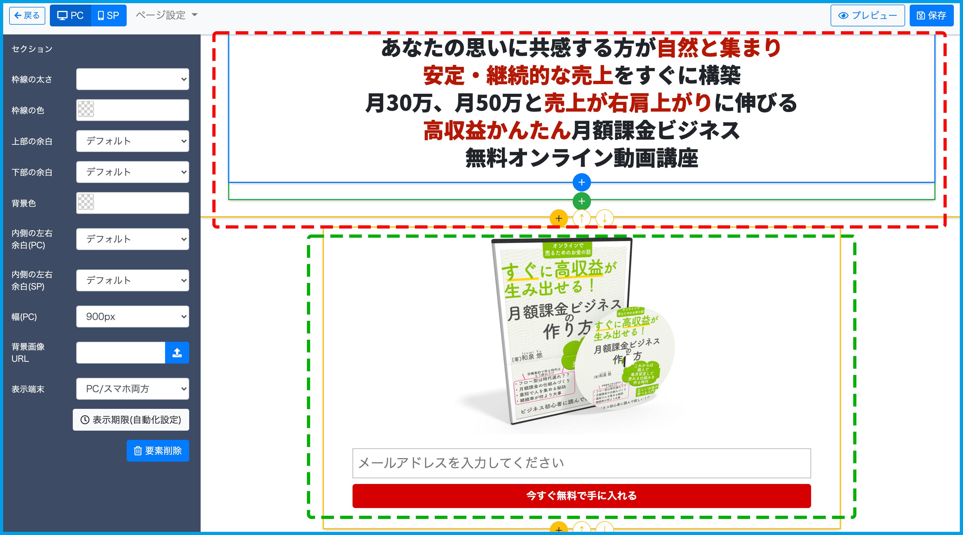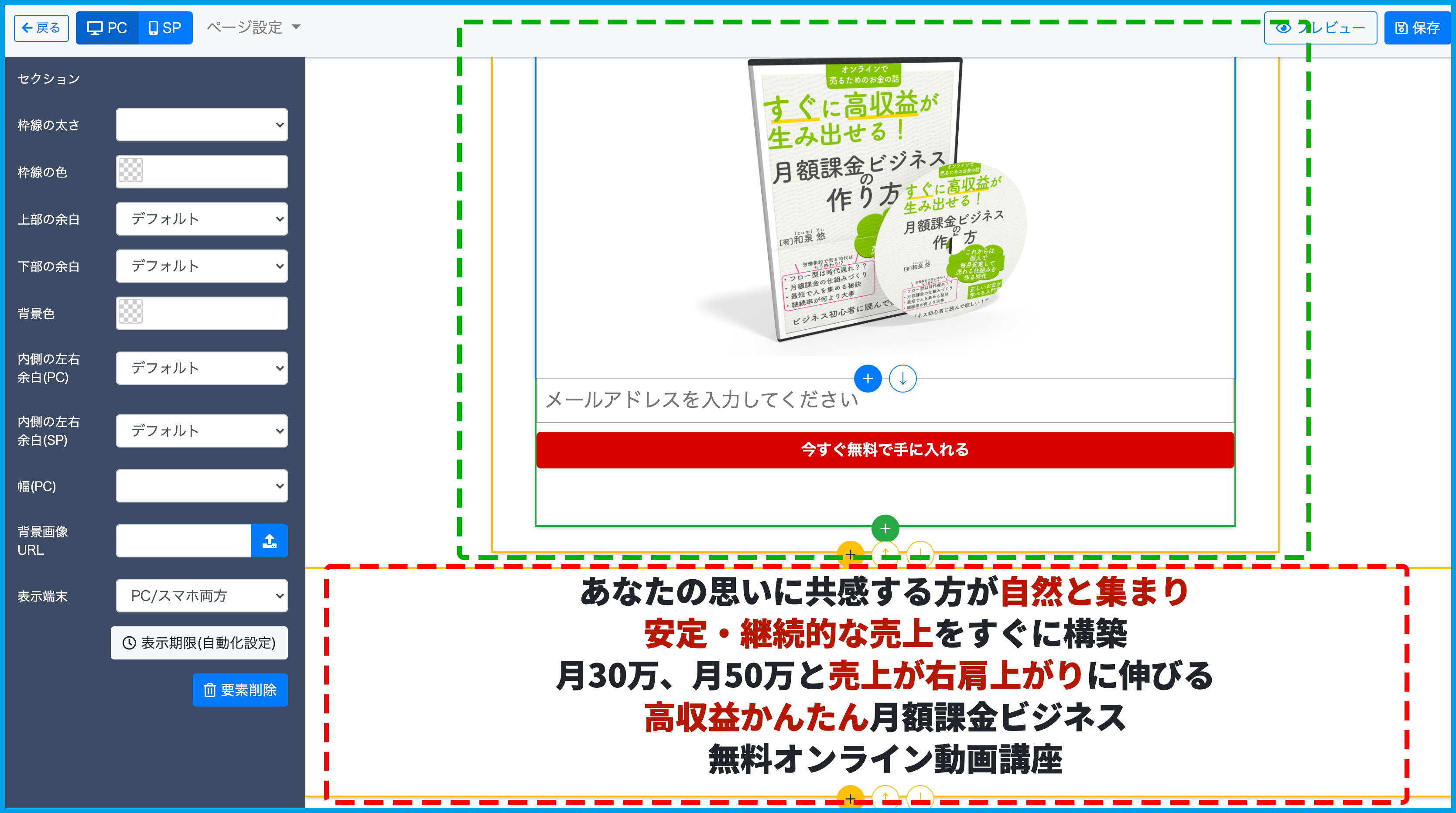 画像と登録フォームのあるセクション(緑点線の枠)の下に移動させる動作を例として説明いたします。