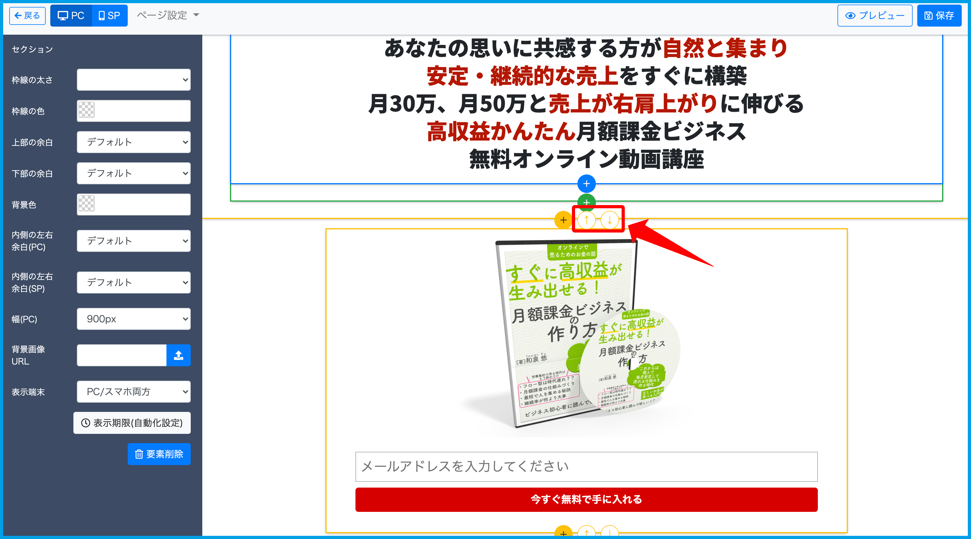 ※今回はセクションを移動しますが、要素・行でも移動可能な時は矢印が表示されますので、同じ操作を行なってください。