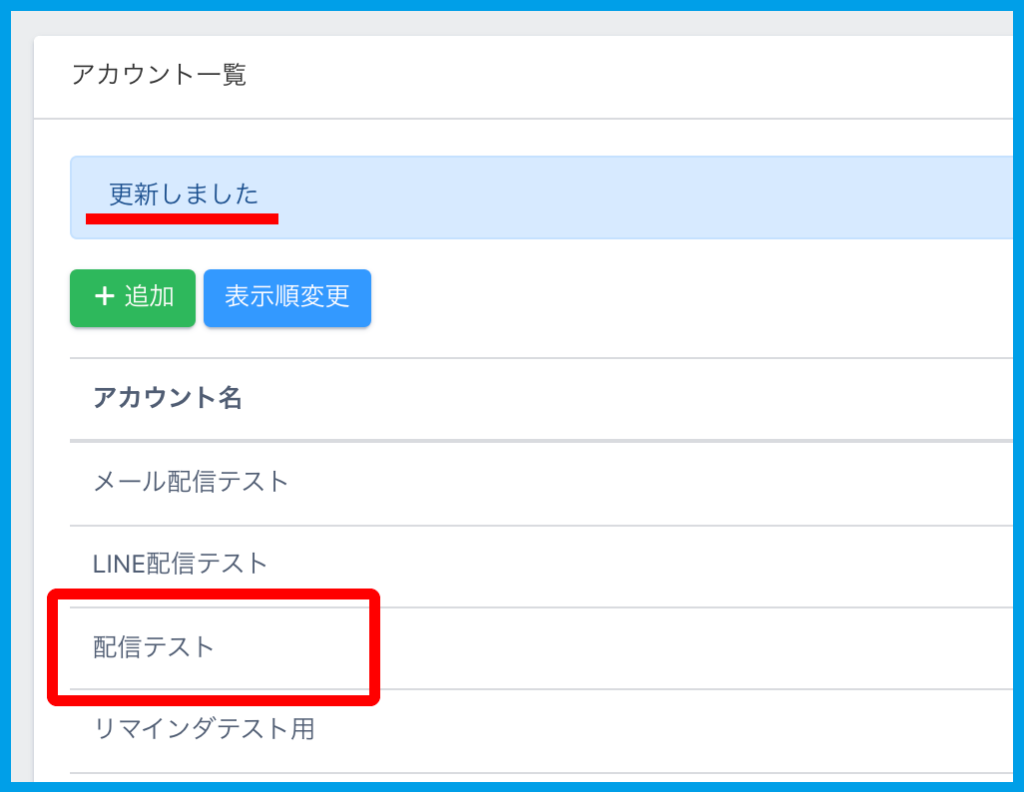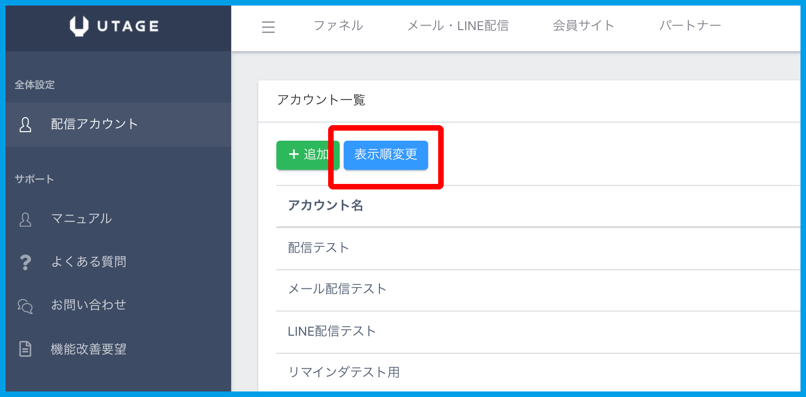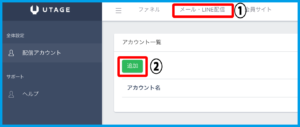 1.上メニューより【メール・LINE配信】をクリックし、「アカウント一覧」ページの追加をクリックします。