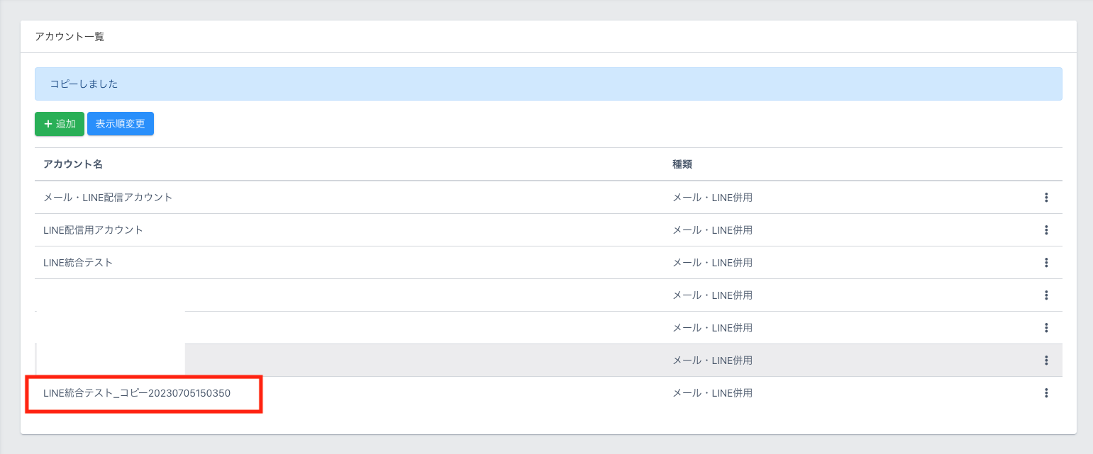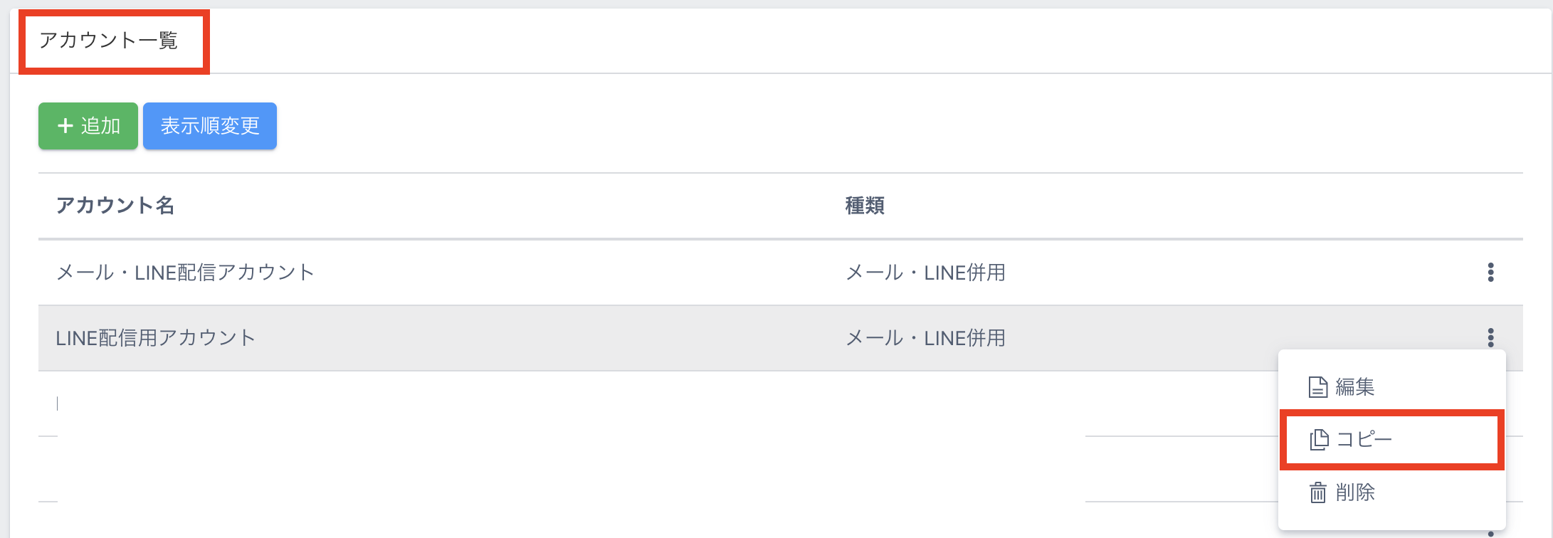 1. アカウント一覧から該当の配信アカウントの操作メニュー【︙】から『コピー』をクリックします。