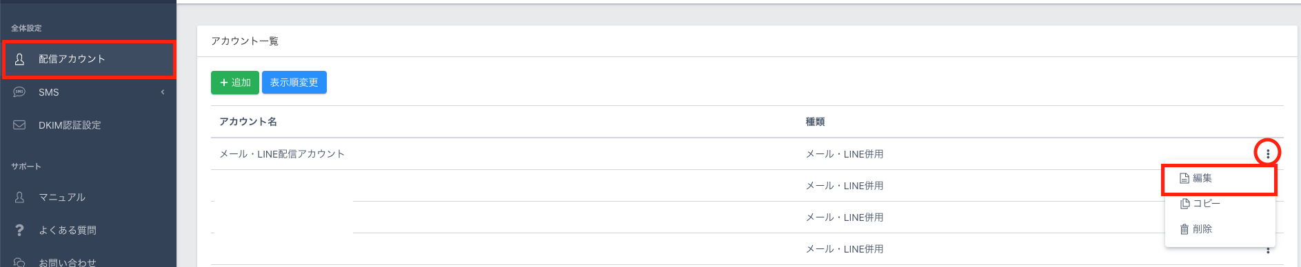 配信アカウントの設定を編集することができます。【︙】操作メニューより【編集】をクリックします。