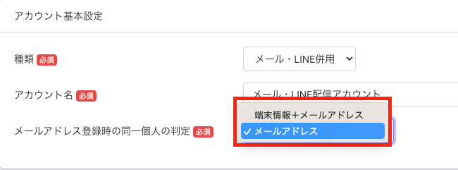 ・メールアドレス登録時の同一個人の判定:同一個人を判定する基準を【端末情報+メールアドレス】【メールアドレス】から選択して頂けます。
