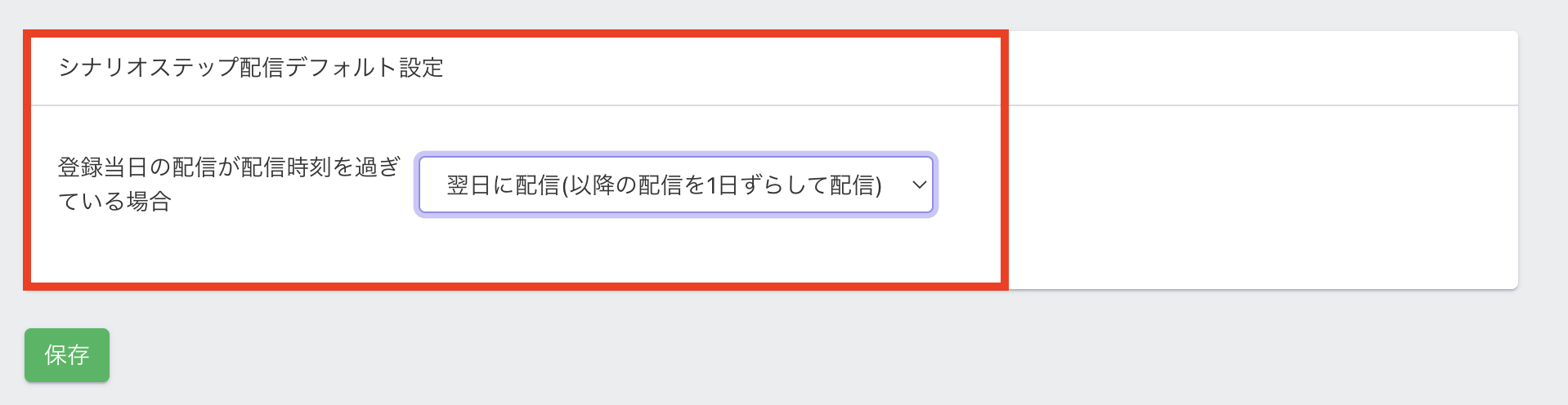 ステップ配信で、登録当日の配信が配信時刻を過ぎている場合『配信しない』『翌日に配信(以降の配信を1日ずらして配信)』より選択して設定することで、以降、追加したシナリオではデフォルト設定した設定でシナリオ追加されます。
