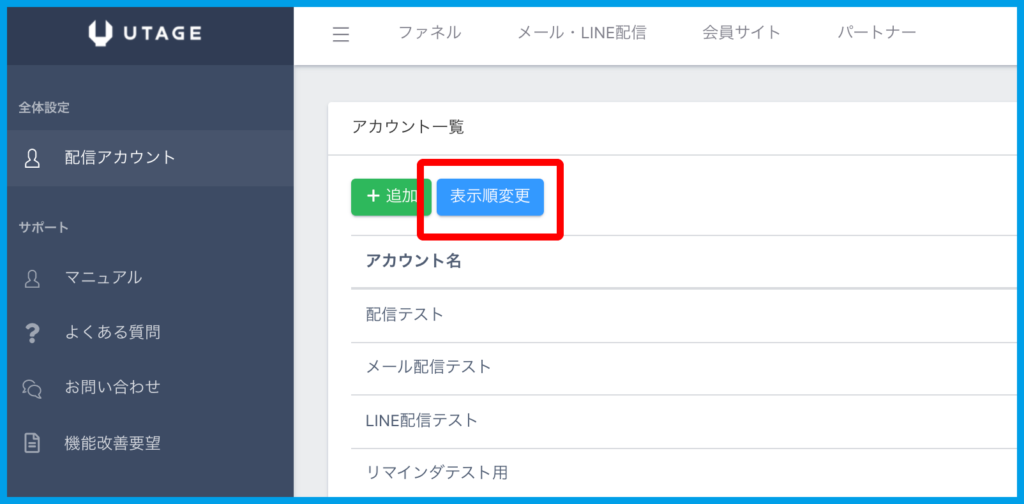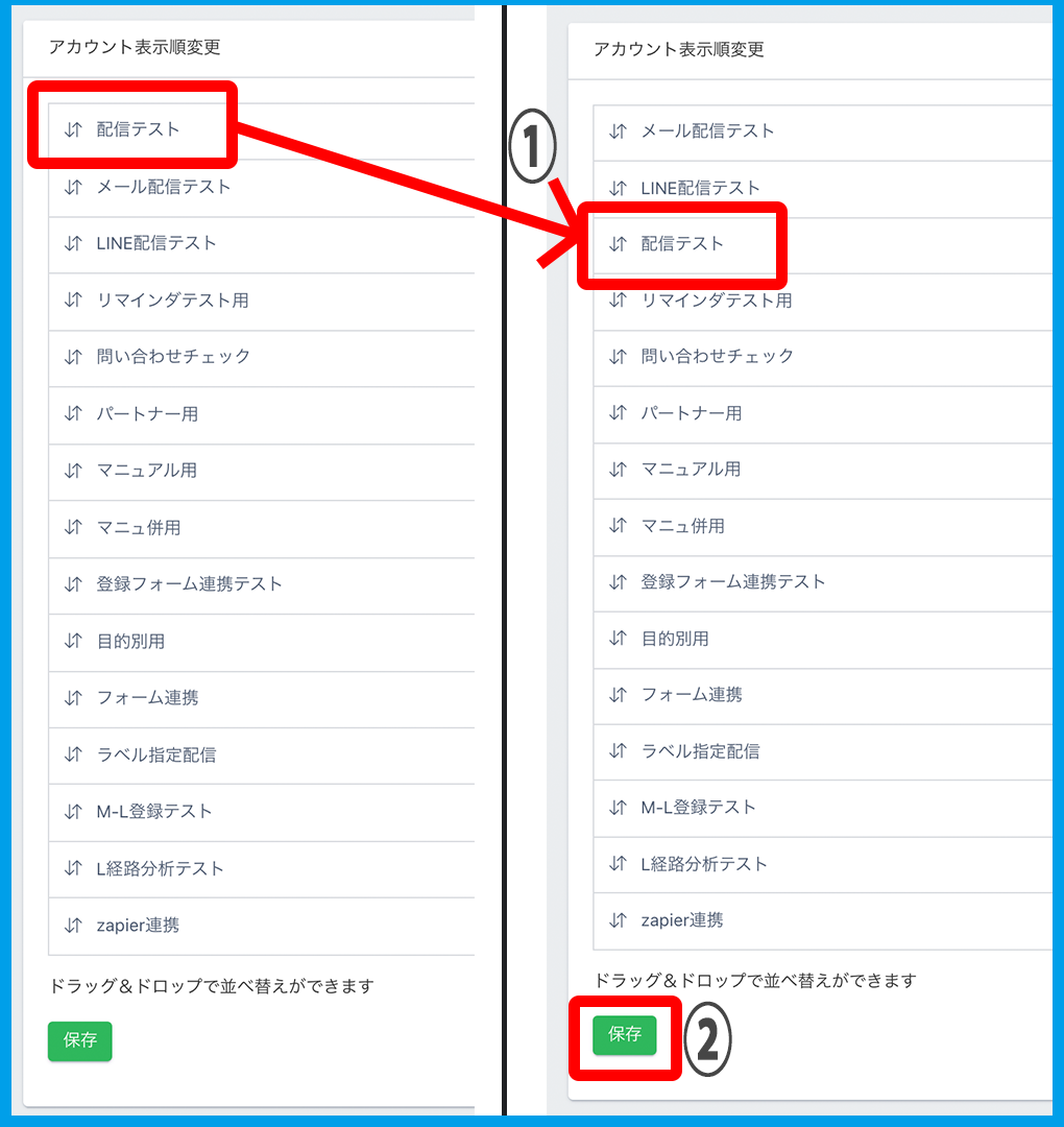2.「アカウント表示順変更」ページになったら、ドラッグ&ドロップで並べ替えて保存をクリックします。