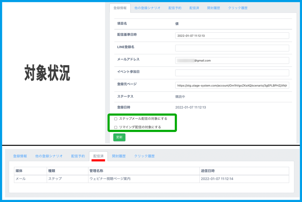 【登録直後】に設定されたメールの配信はされず、ステップ配信は対象、リマインダ配信は対象外として登録されます。