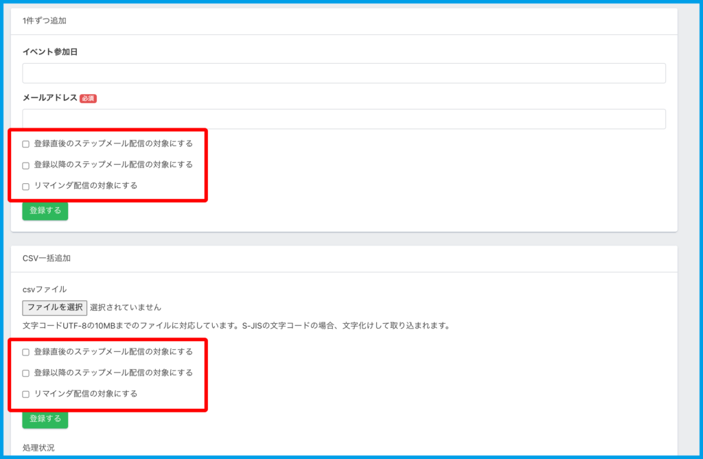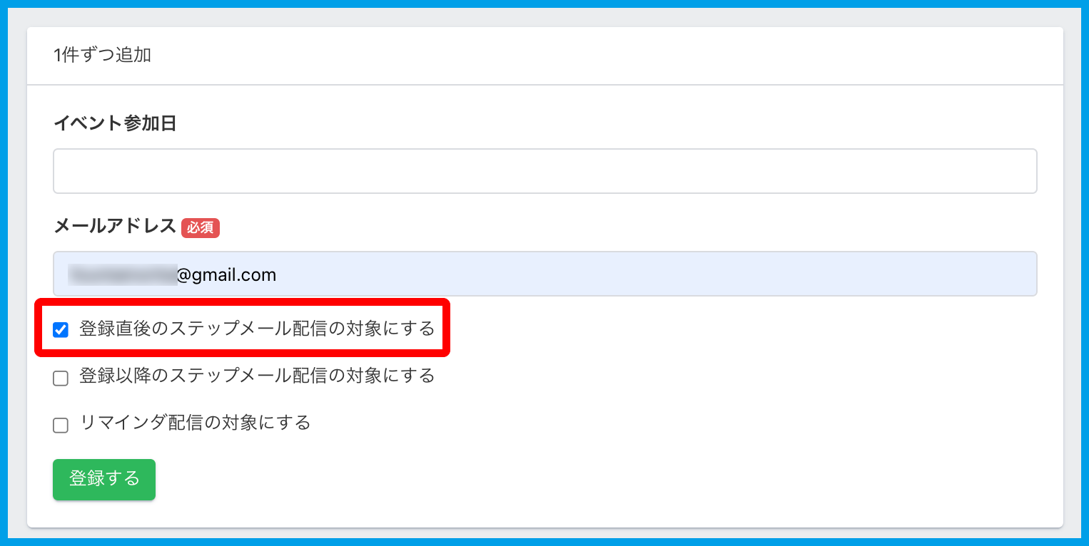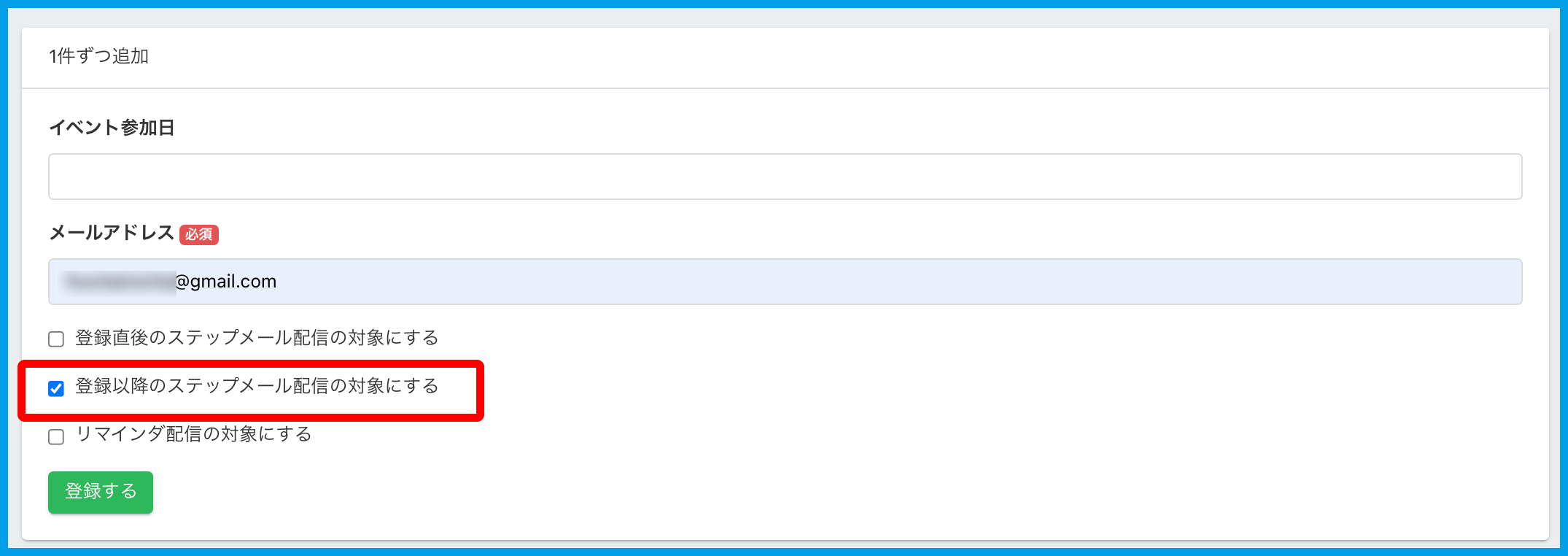 ・登録以降のステップメール配信の対象にする:メール送信タイミングを登録以降の日時指定にしているステップ配信の対象にすることができます。