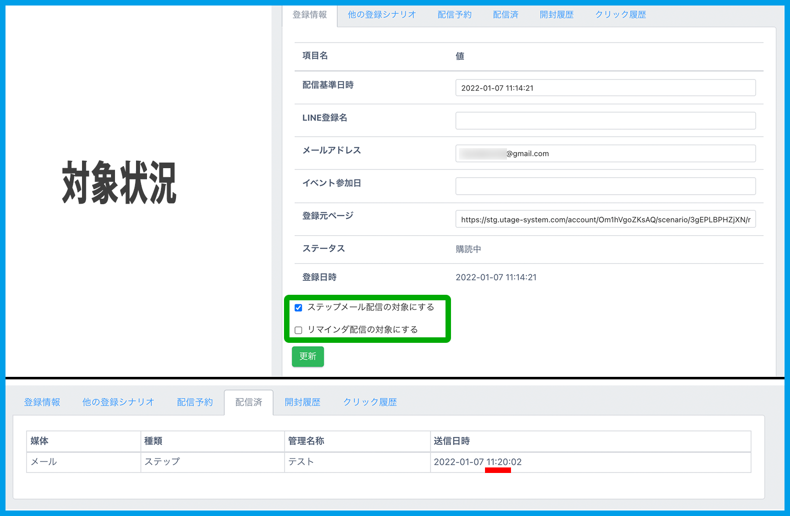 ・登録直後のステップメール配信の対象にする:メール送信タイミングを【登録直後】にしているメールが追加直後に配信されます。