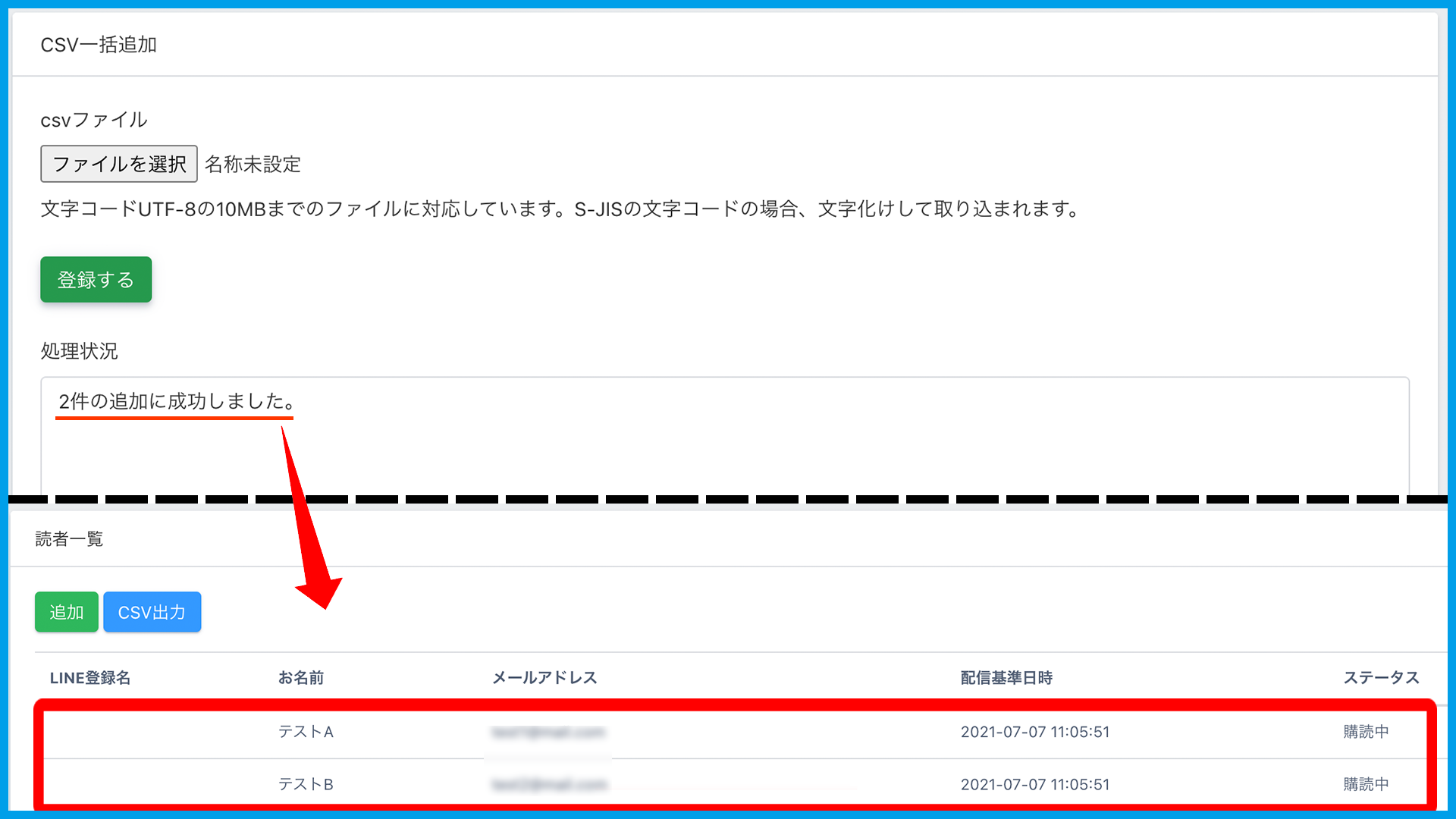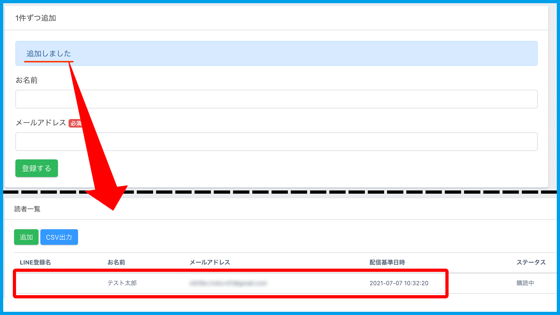 通常、読者は登録フォームより登録された際に自動で追加されますが、