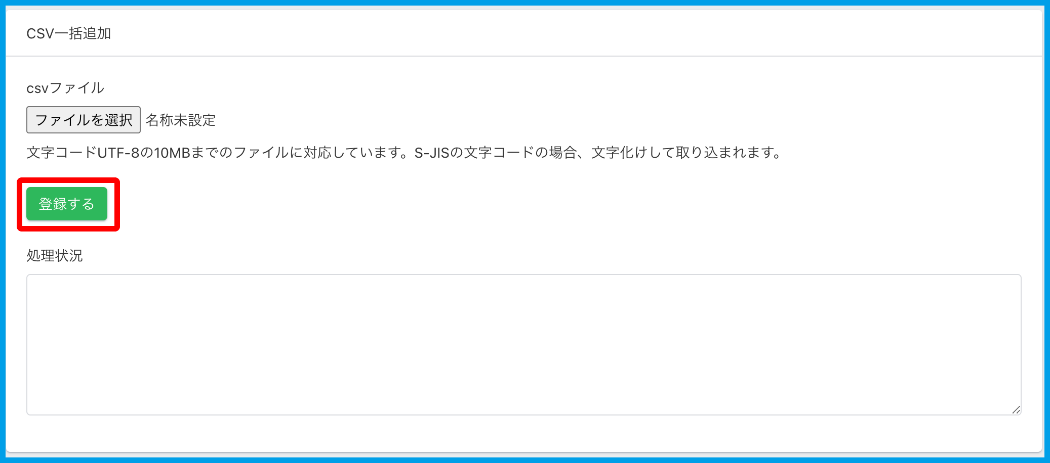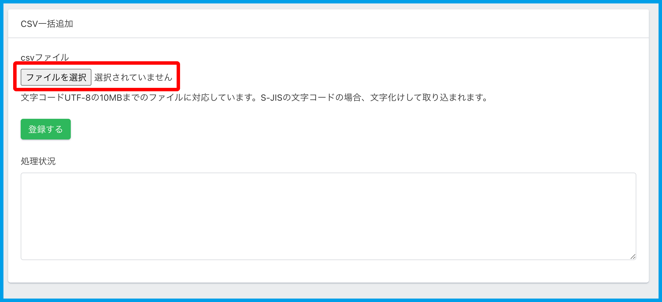 1.【ファイルを選択】をクリックし、ポップアップウィンドウにて追加するCSVファイルを選択します。