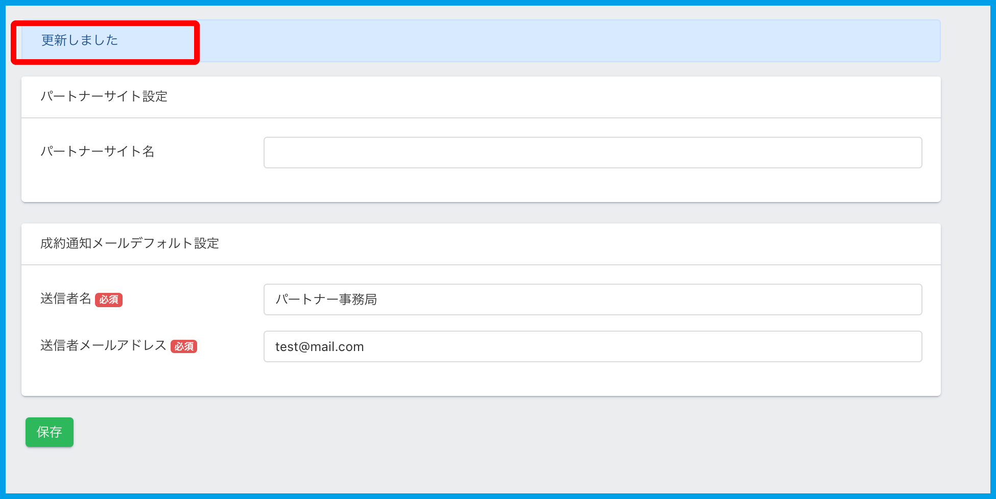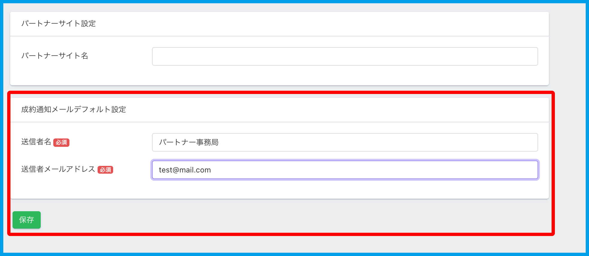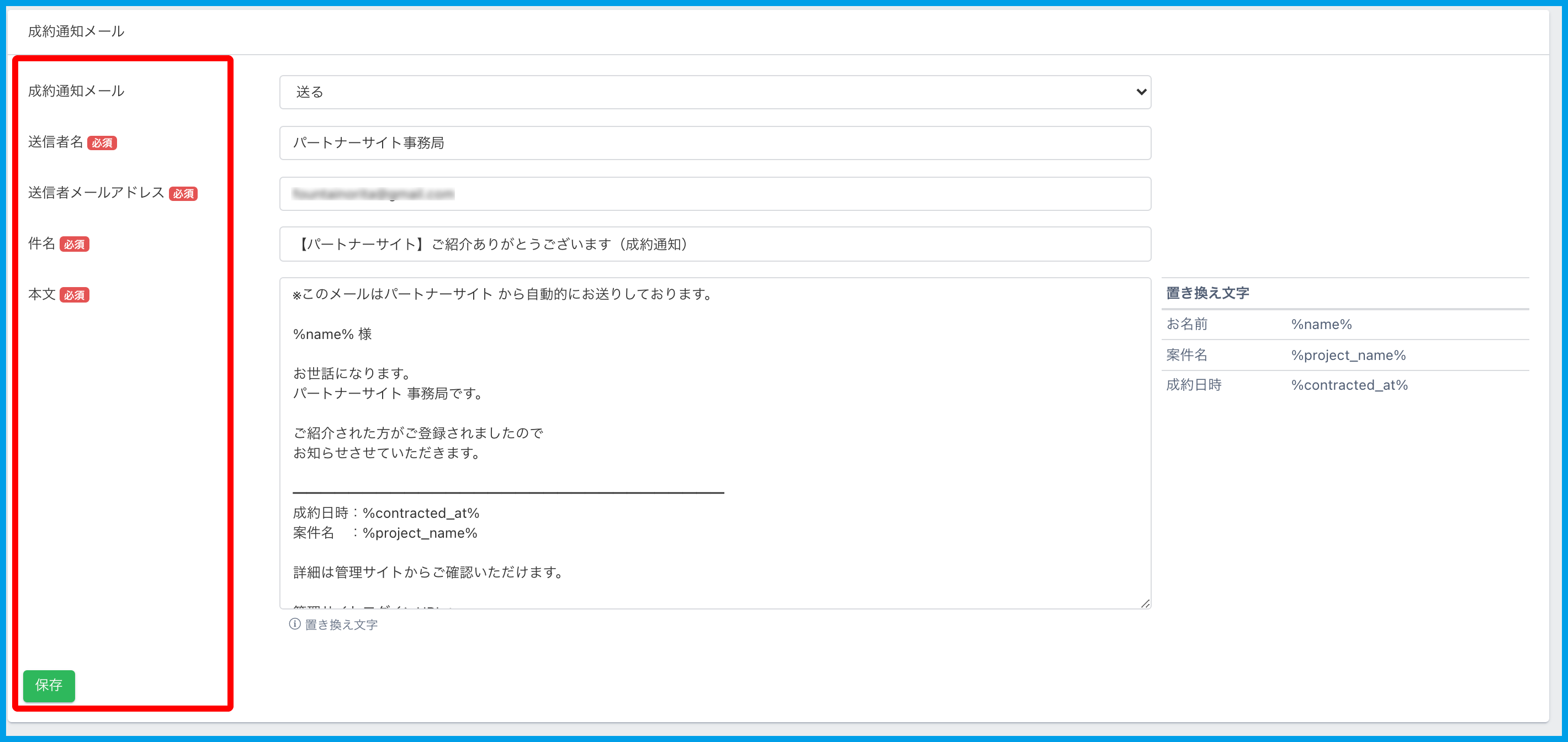 ・成約通知メール:パートナーに成約通知を「送る」「送らない」を設定できます。