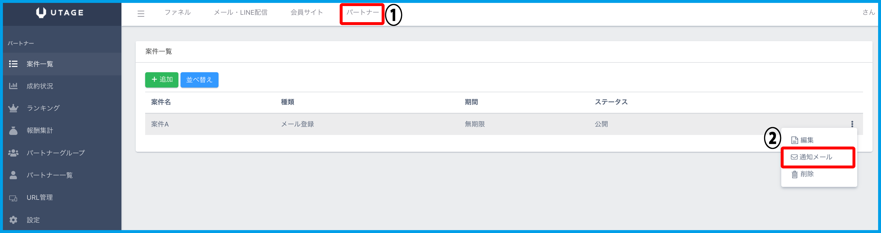 1.上メニュー【パートナー】>「案件一覧」の「︙」より「通知メール」をクリックします。