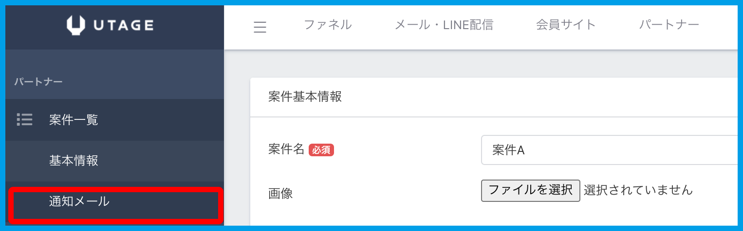 もしくは、案件を選択後に左メニュー【通知メール】をクリックしてください。