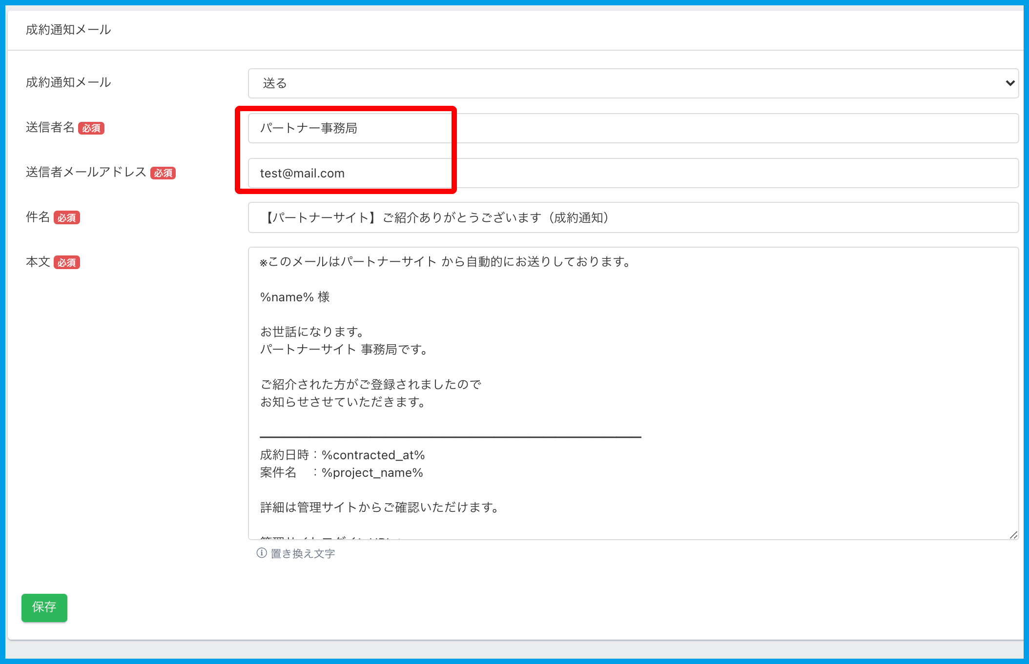 2.「成約通知メールデフォルト設定」の設定を行い【保存】をクリックします。