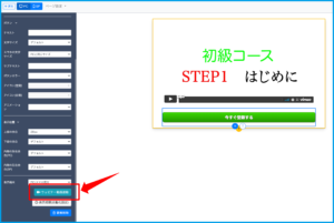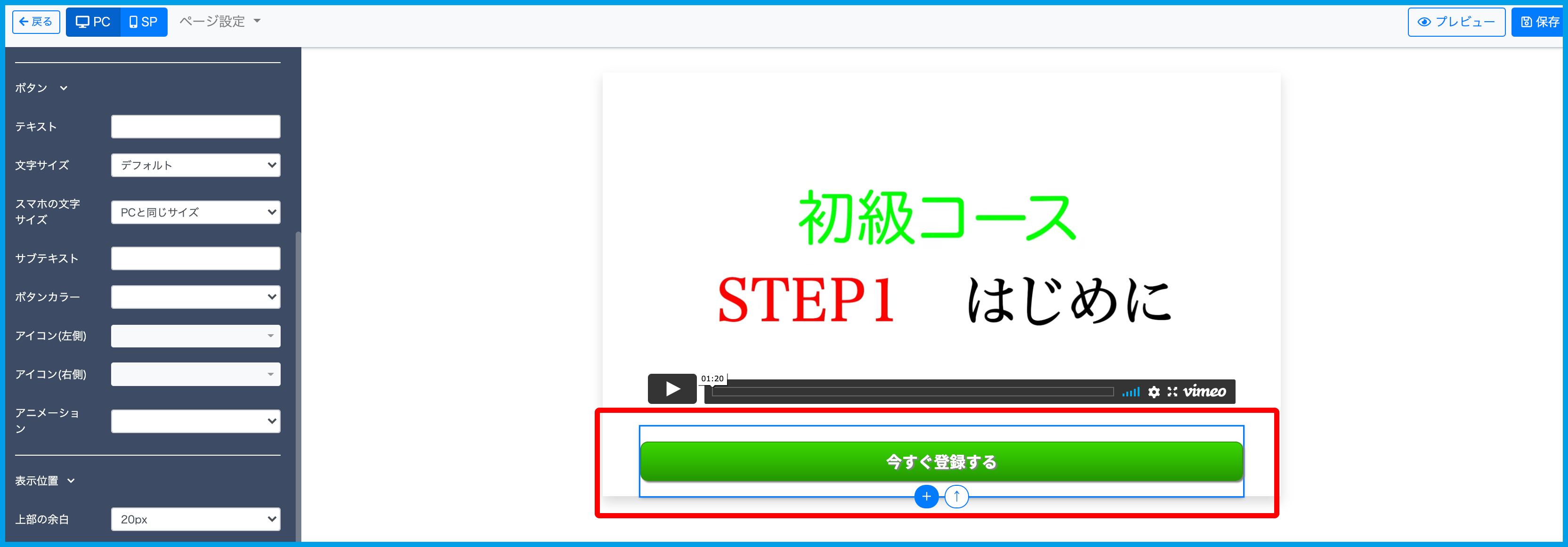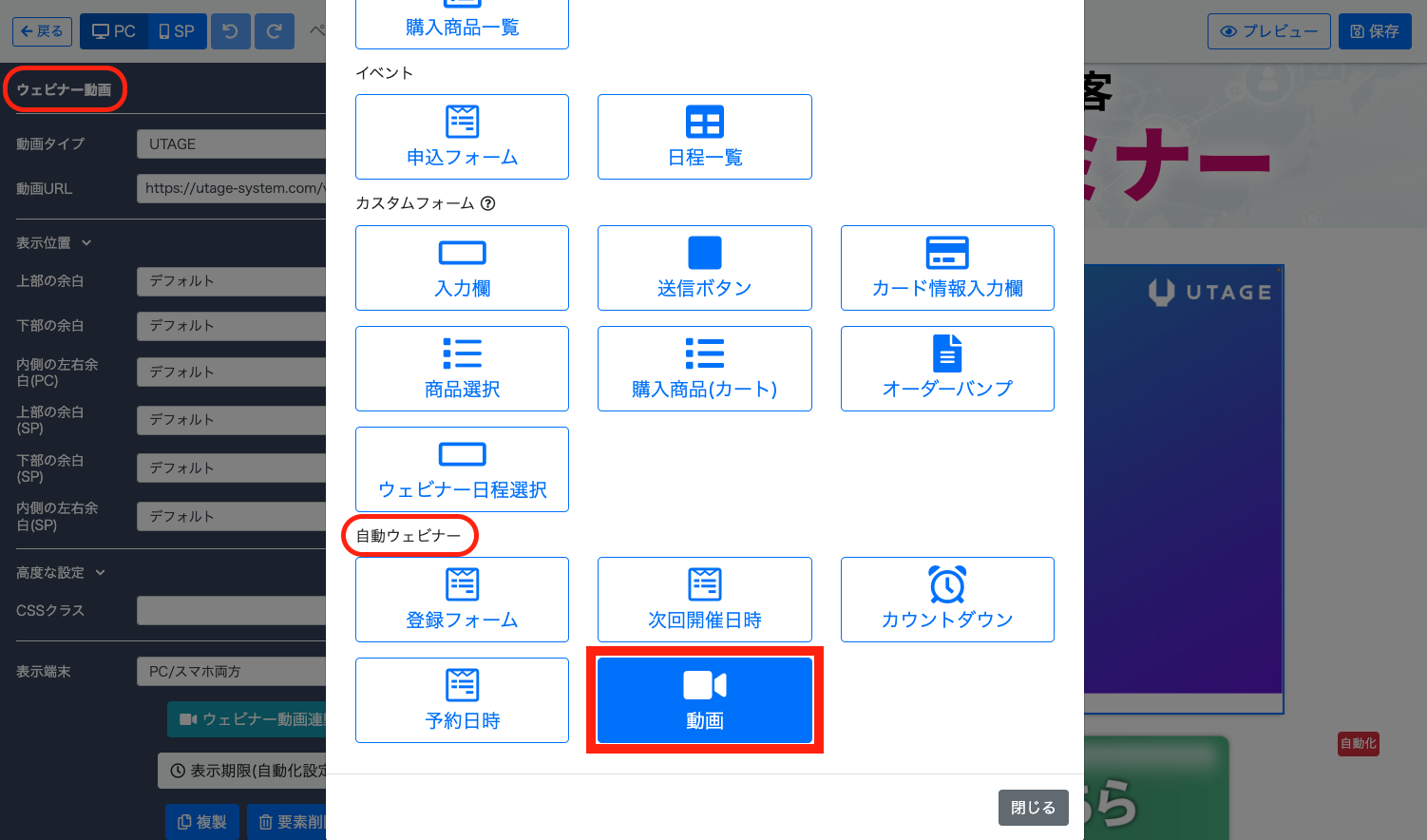 1.「自動ウェビナー」の【動画】があるページで【ボタン】要素を追加します。