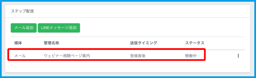 ※登録直後などに配信したい場合にはステップ配信、参加日前日などに配信したい場合にはリマインダ配信をご参考ください。