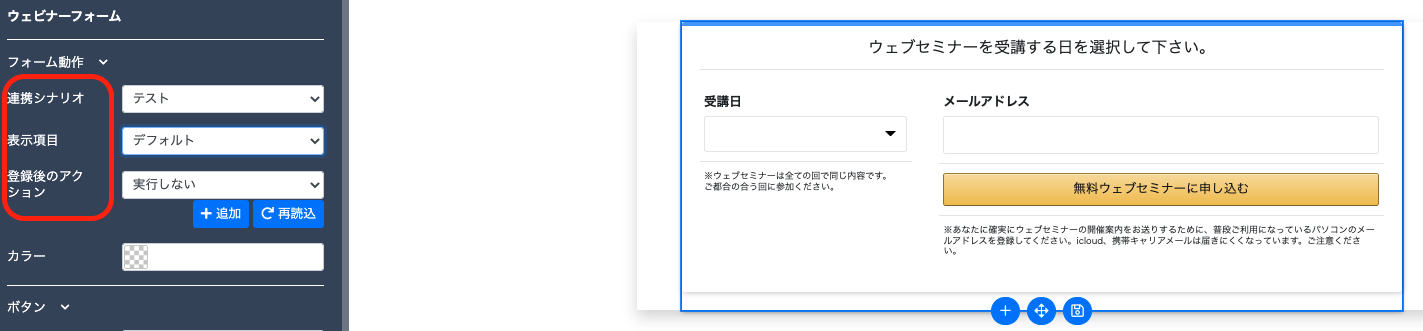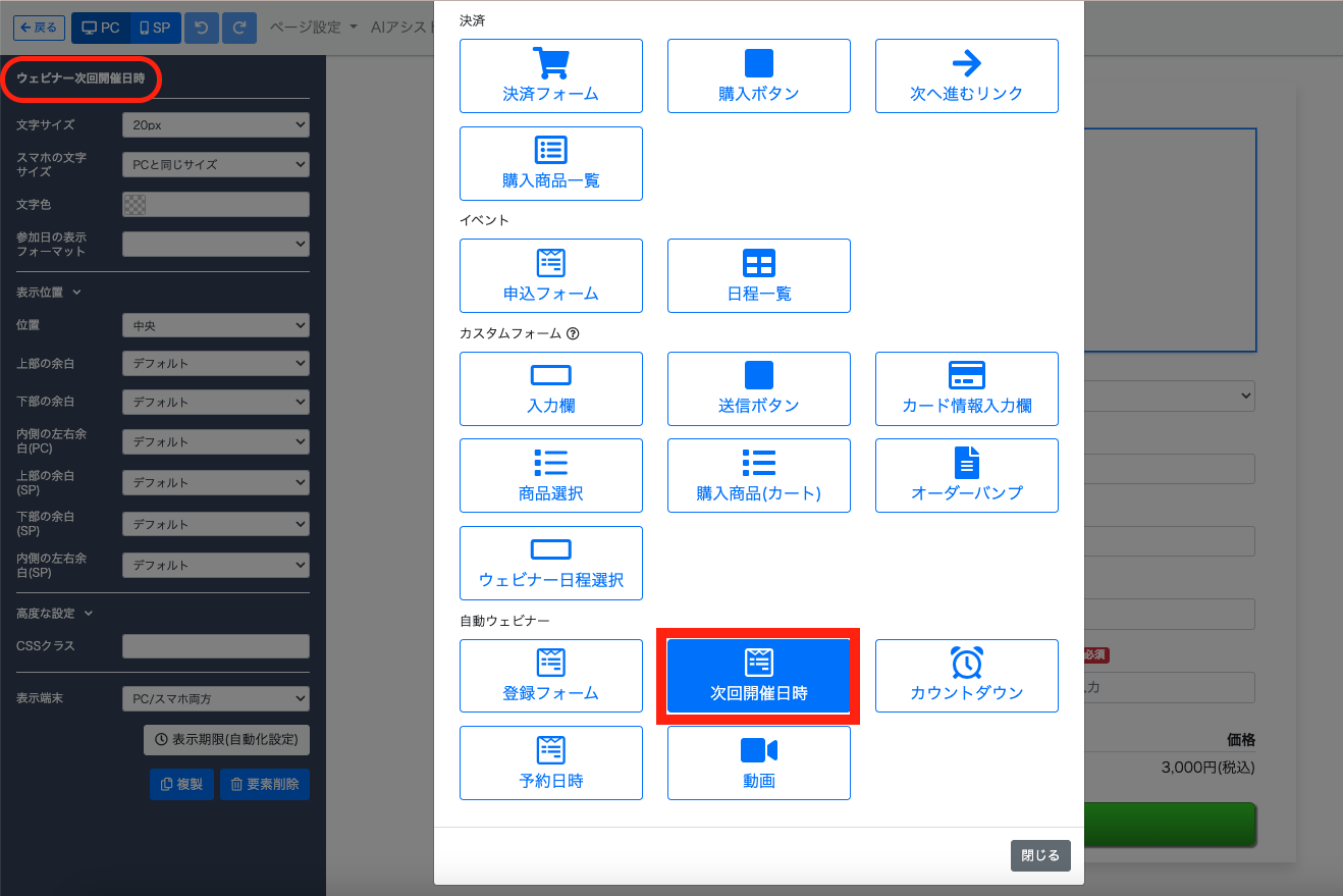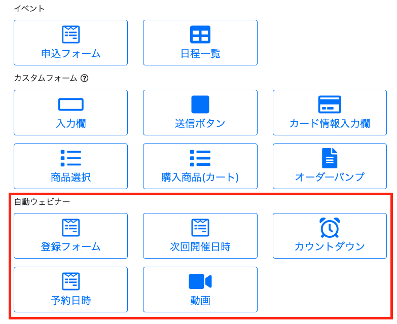 【登録フォーム】【次回開催日時】【カウントダウン】【予約日時】【動画】が自動ウェビナー要素としてあります。