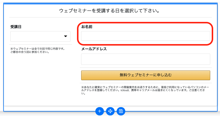 カスタムフォームの【入力欄】を挿入し、お名前やメールアドレス入力欄を挿入します。