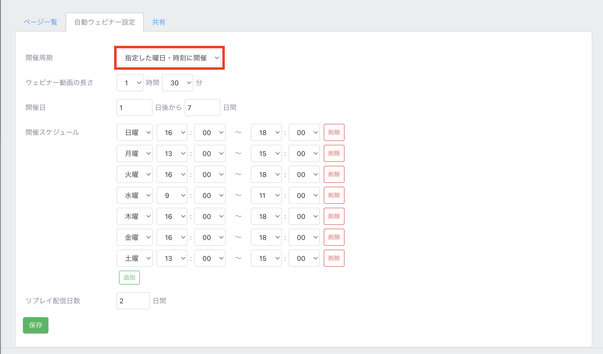 【自動ウェビナー設定】の開催周期を【指定した曜日・時刻に開催】を選択し、ウェビナー動画の長さ、開催日、開催スケジュール、リプレイ配信日数を設定する。