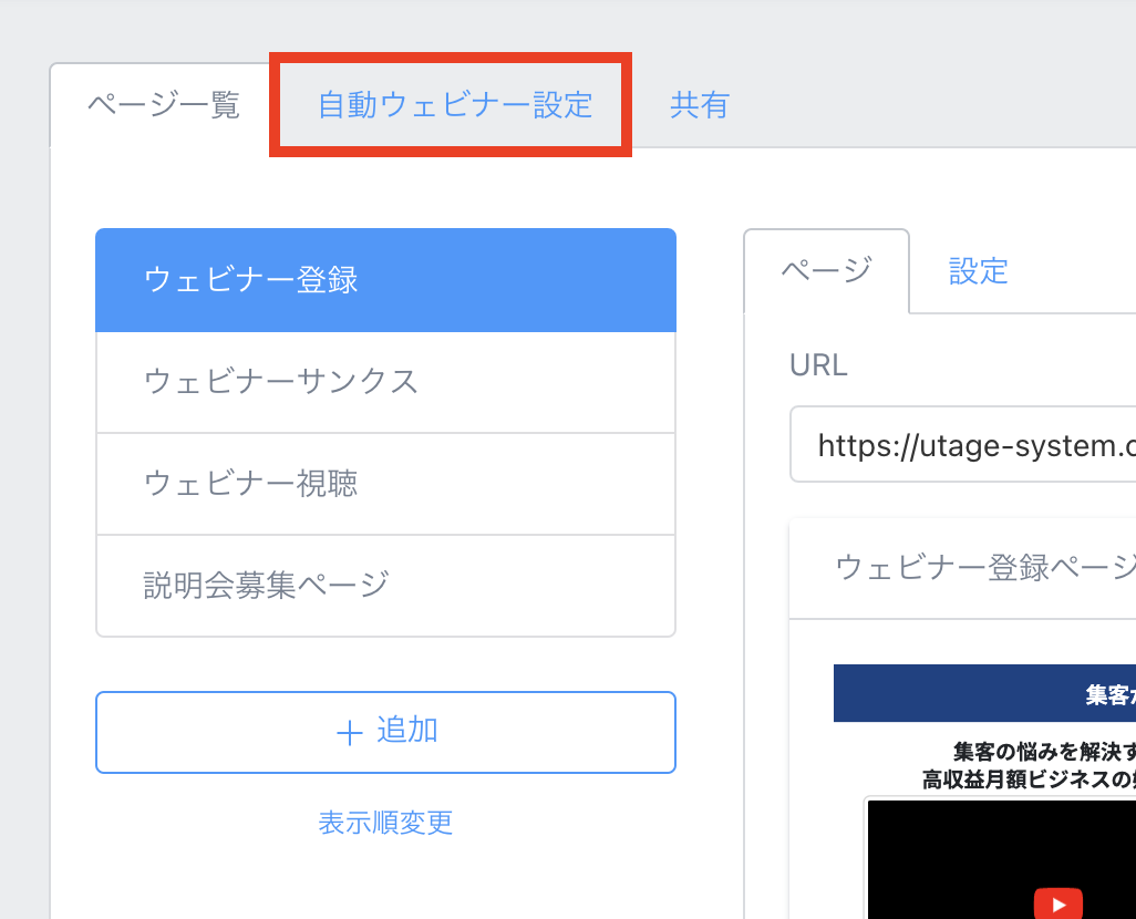 ※【自動ウェビナー設定】タブは、ページ内に「自動ウェビナー」の【登録フォーム】が設置されていないと表示されません。