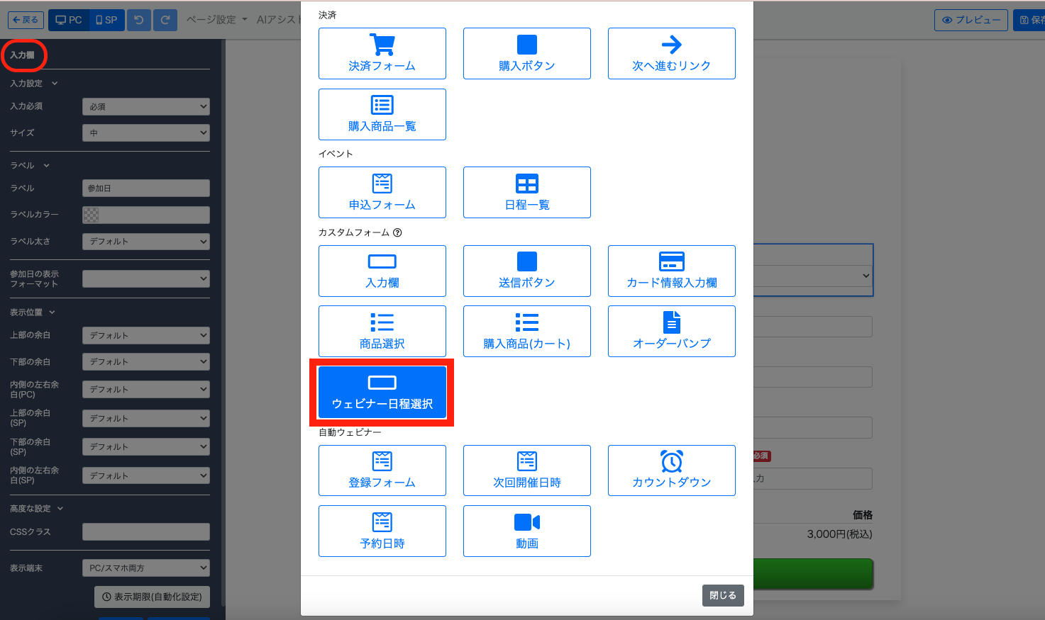 2.ポップアップ表示内にて「自動ウェビナー」の追加したいフォームををクリックします。