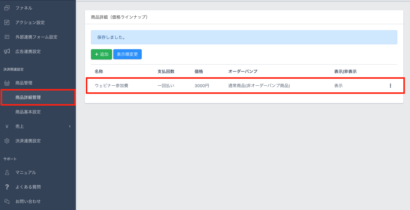 1.商品管理>商品詳細(価格ラインナップ)より、自動ウェビナーの有料商品を作成します。