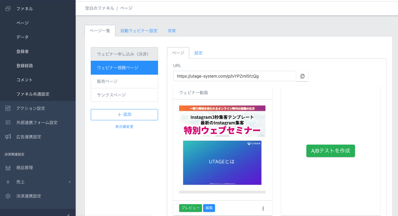【ファネル】>「ファネル一覧」該当ファネル>「ページ一覧」該当ページ >【編集】をクリック