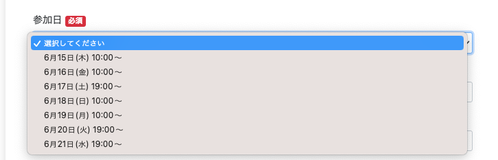 カスタムフォームの【ウェビナー日程選択】を追加すると、参加日を選択することができます。