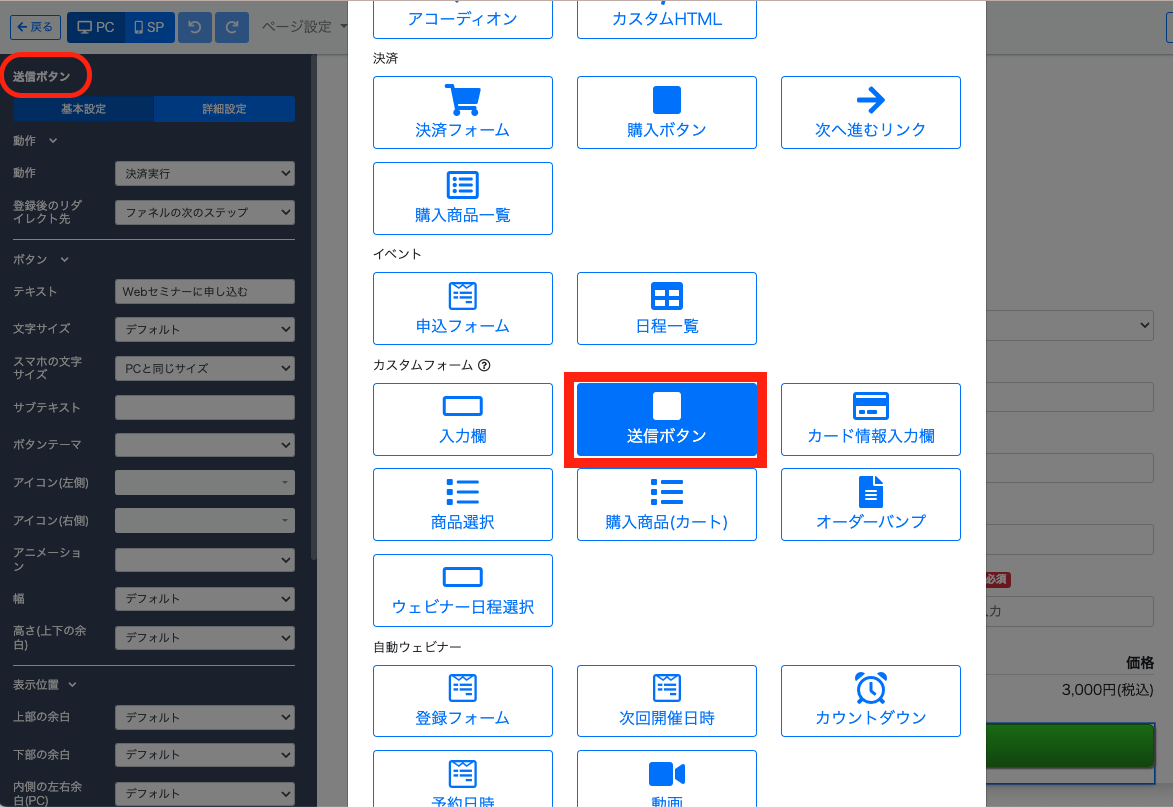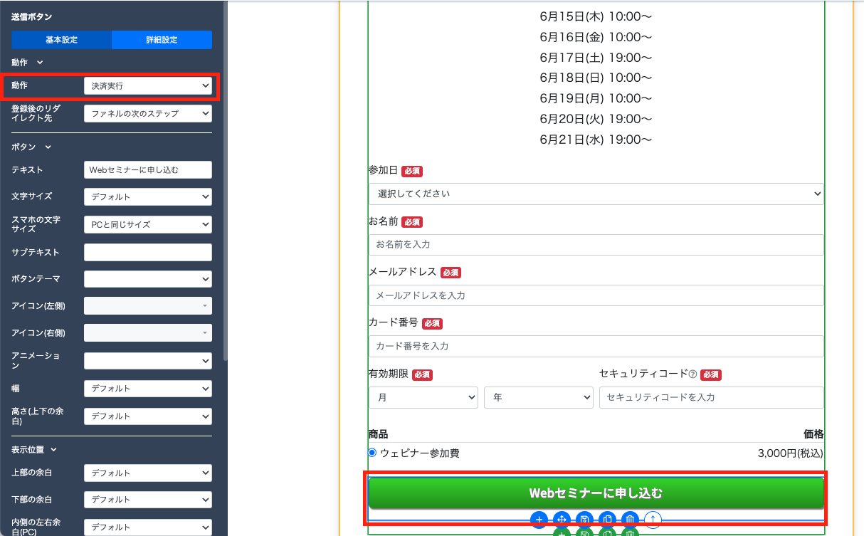 カスタムフォームの【送信ボタン】を挿入し、動作>決済実行を選択すると決済することができます。