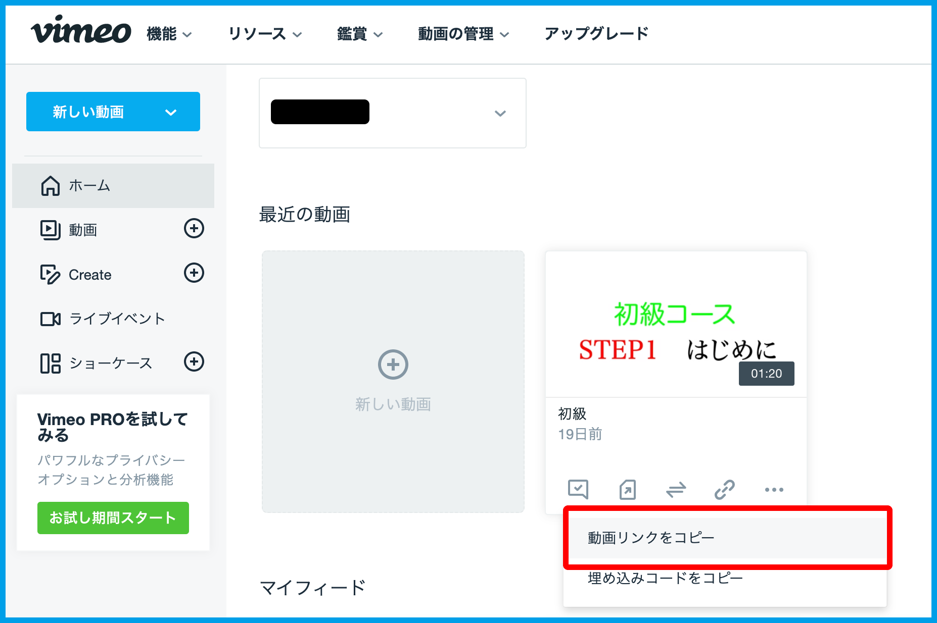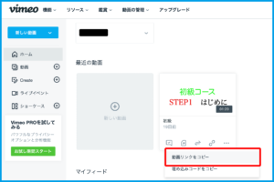 アカウントメニュー【動画管理】を開き、掲載したい動画のリンクをコピーします。