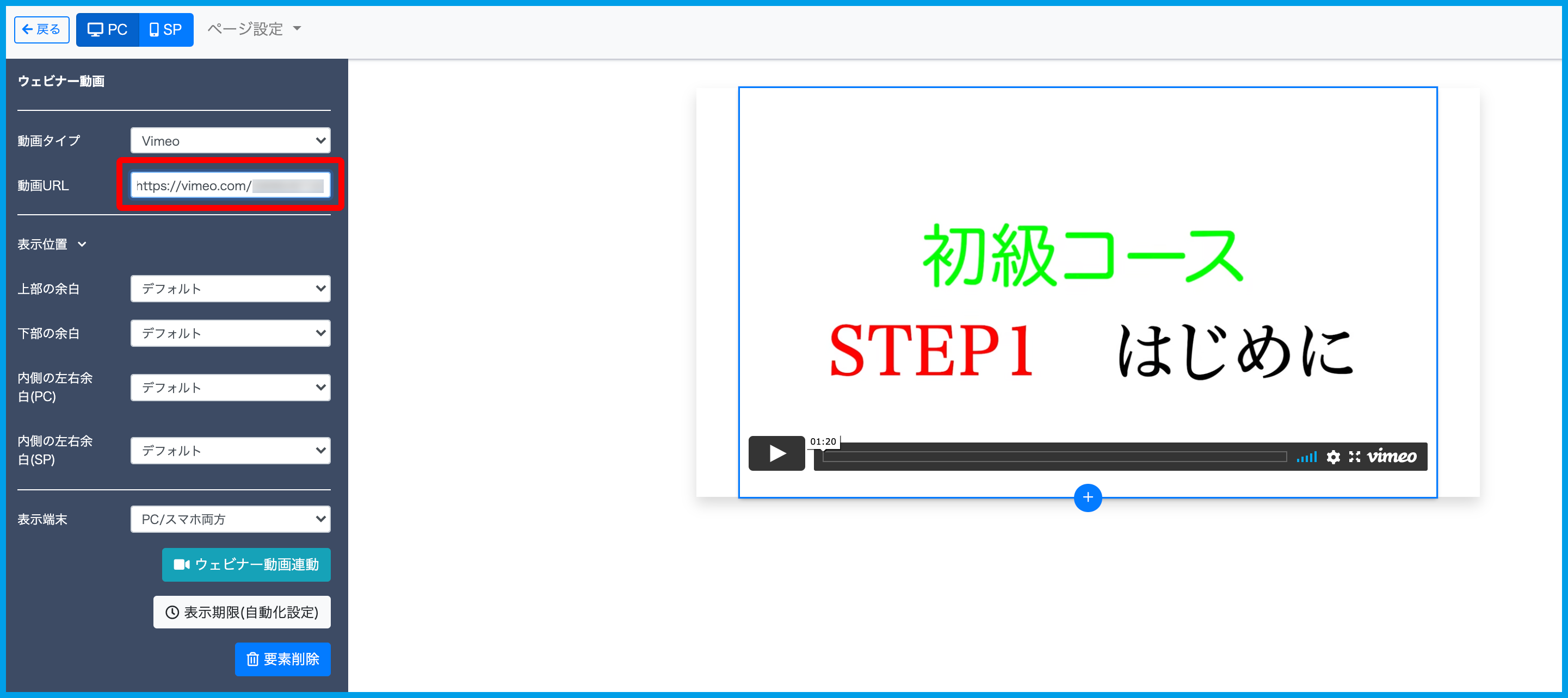 3.設定メニューの「動画URL」にリンクを貼り付け、動画が反映されたら完了となります。