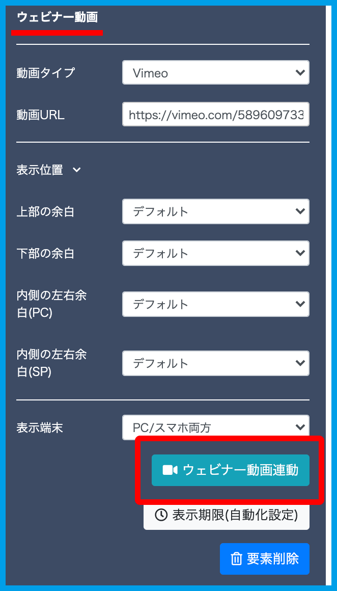 ウェビナー視聴ページには、自動ウェビナーの『動画』要素を挿入してください。
