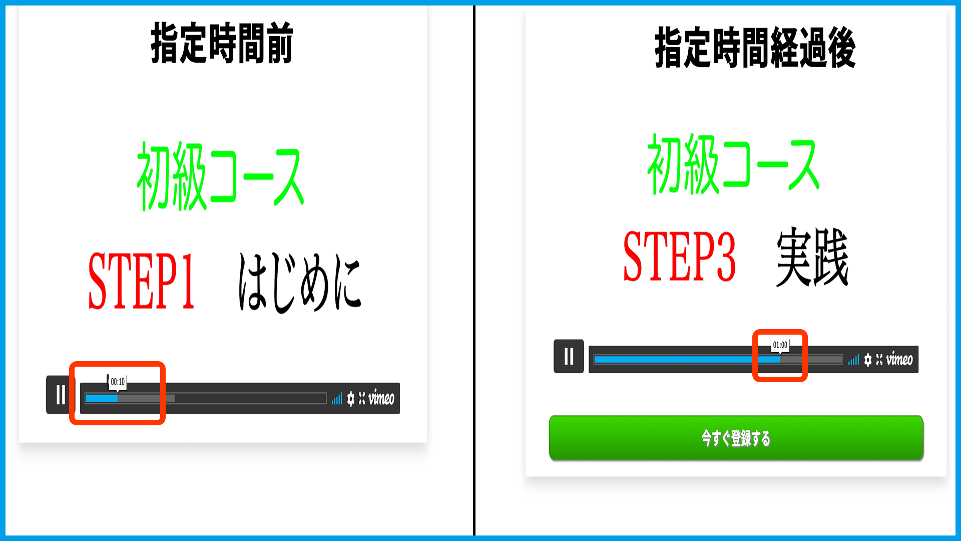 ・指定した時間動画が再生された後に表示する:「動画」の設定メニューで指定した時間まで視聴されたら表示されるようになります。