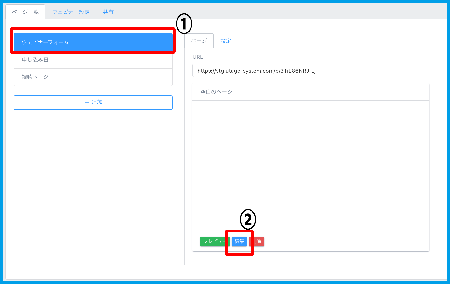 1.【ファネル一覧】で編集するファネルを選択し【ウェビナー設定】タブをクリックします。