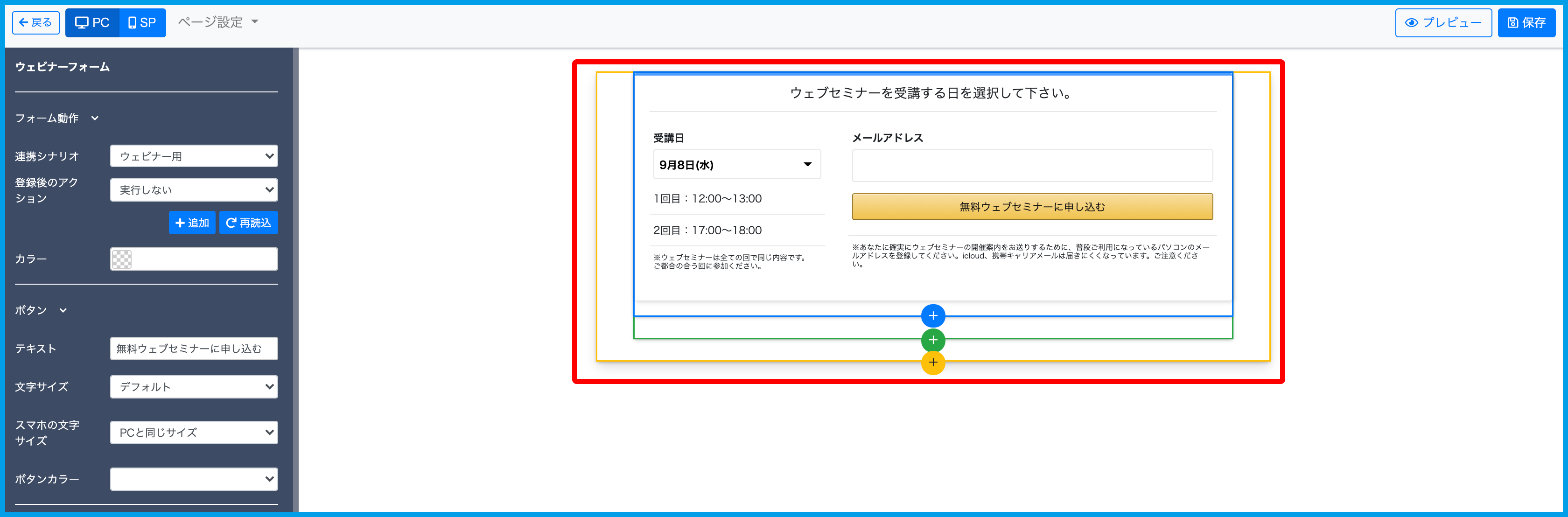 1.ページ編集画面にて「登録フォーム」を追加したい場所の【+】をクリックします。