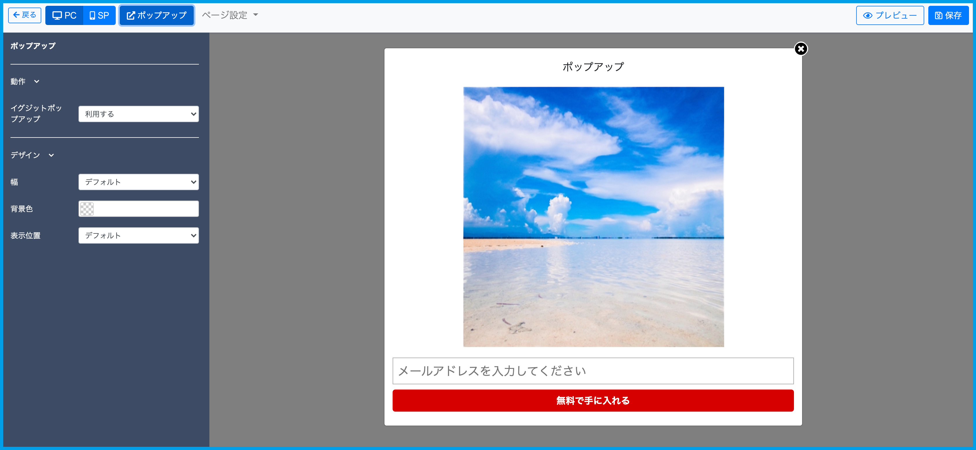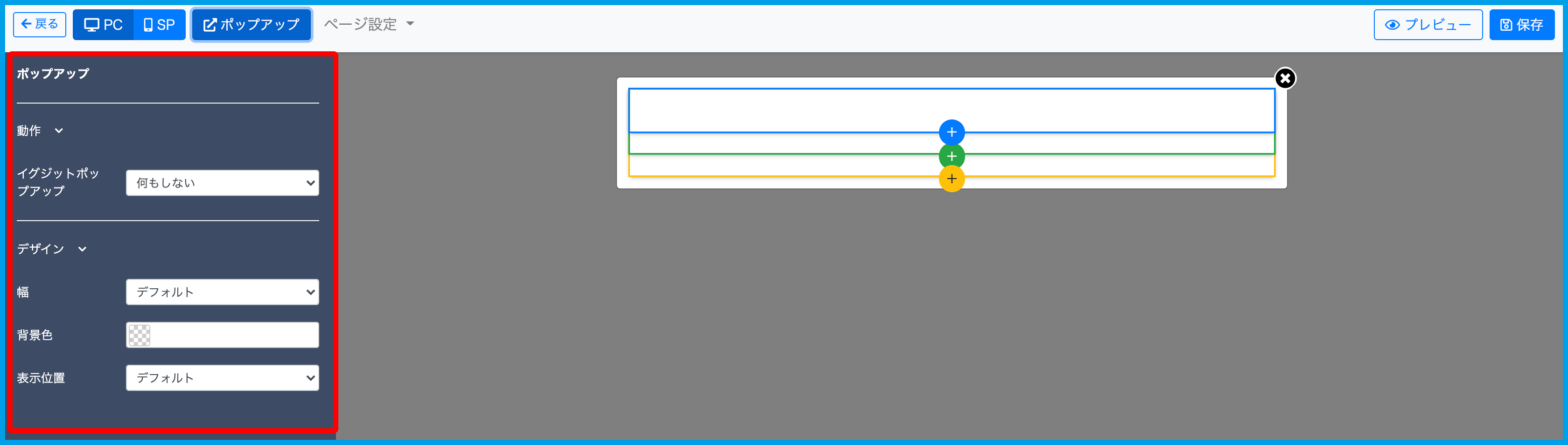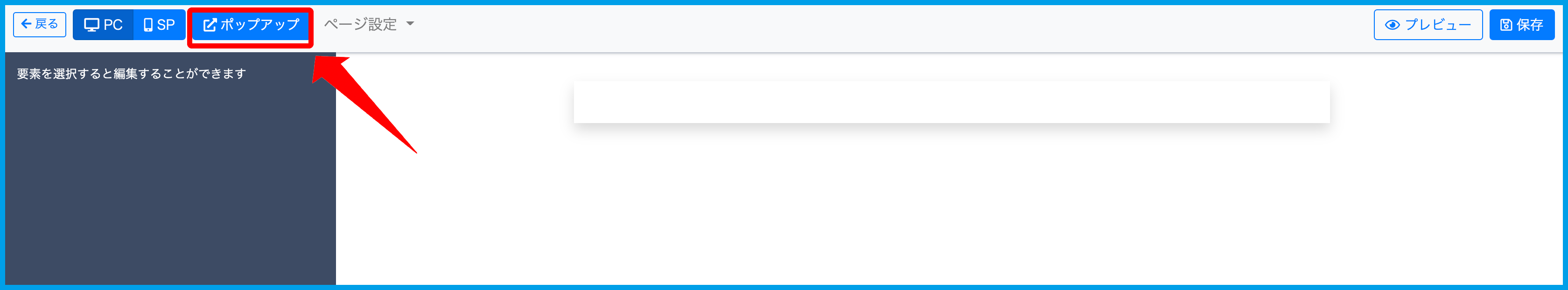 1.左上の【ポップアップ】メニューをクリックし、ポップアップ編集画面にします。
