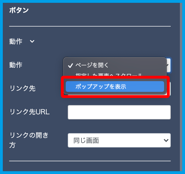 2.ボタン詳細メニューの「動作」で【ポップアップを表示】を選択してください。