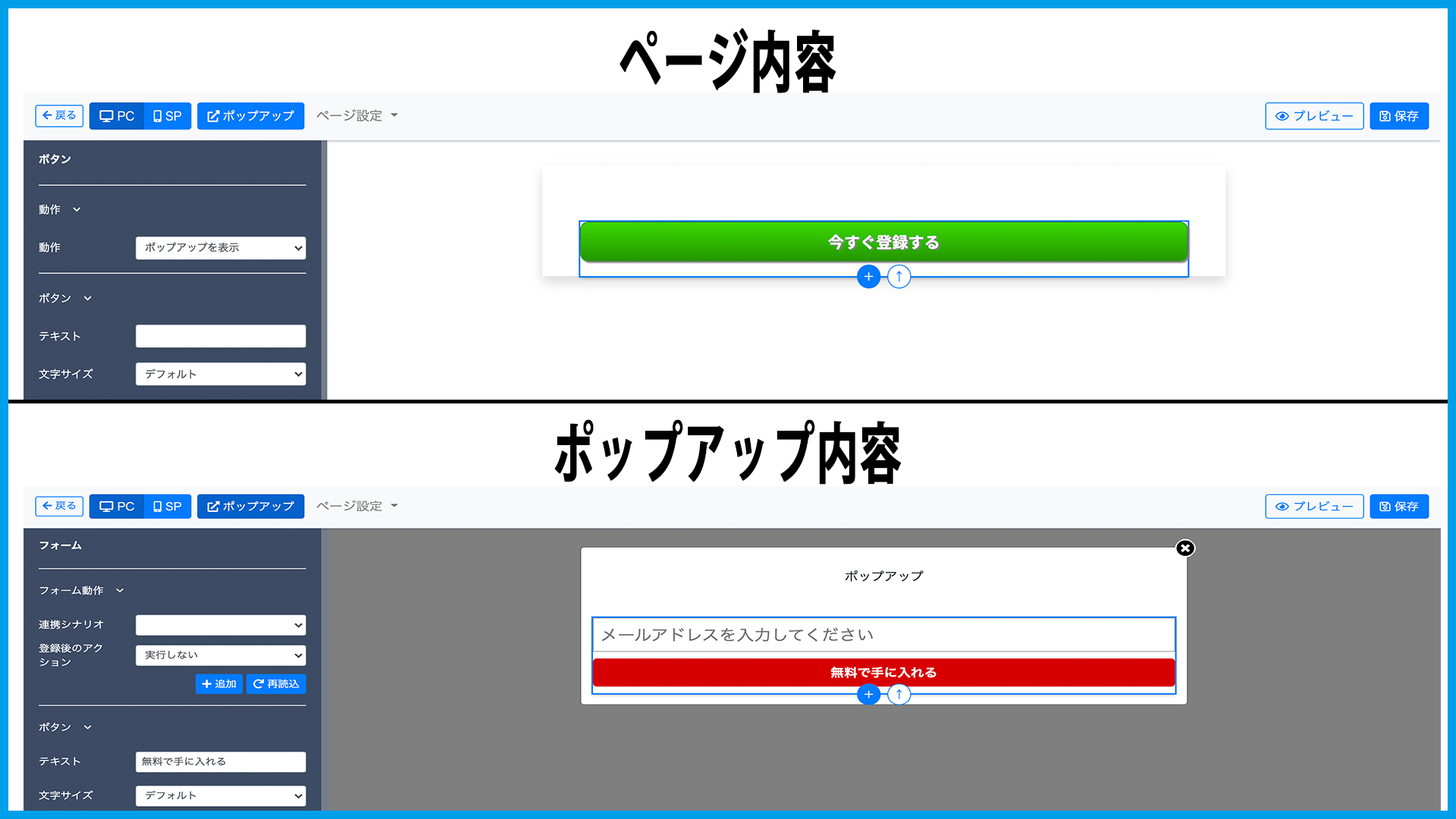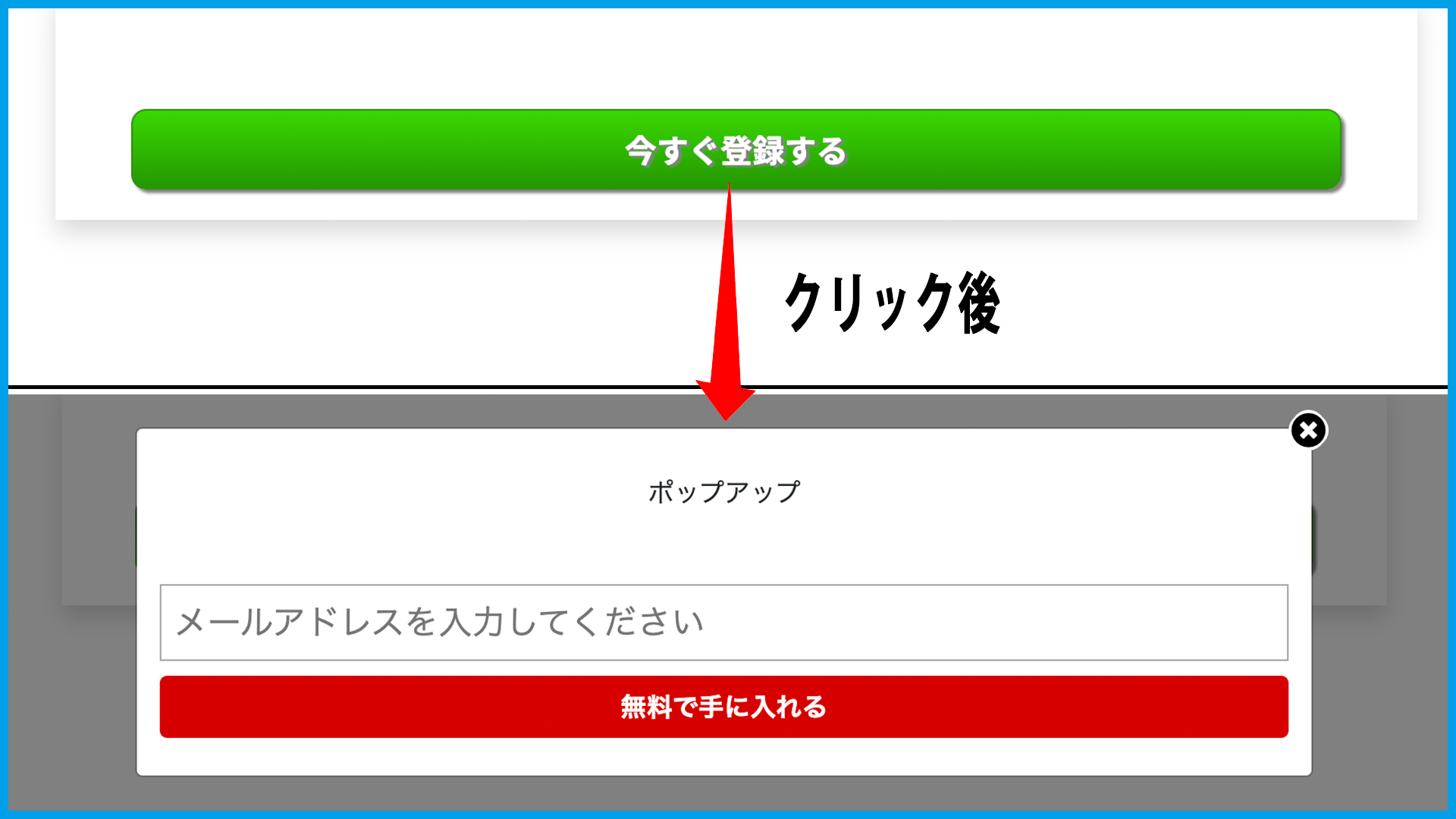 例)ページの「メールアドレスを登録する」ボタンを押す→登録画面のポップアップを表示する。