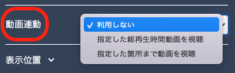 指定した箇所まで動画を視聴:実際に視聴したかどうかに関わらず、指定した箇所になった段階で連動した要素の制御がされます。