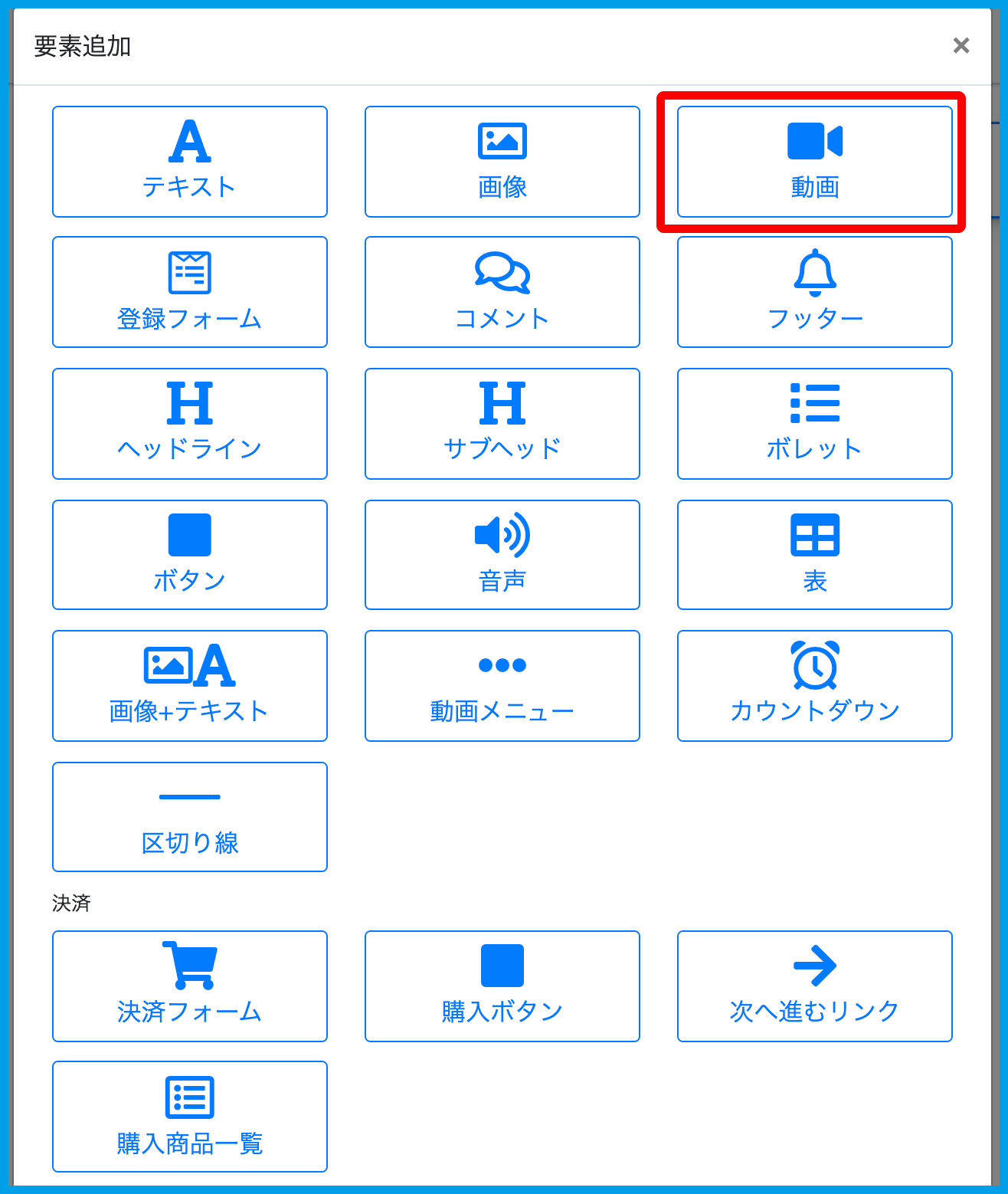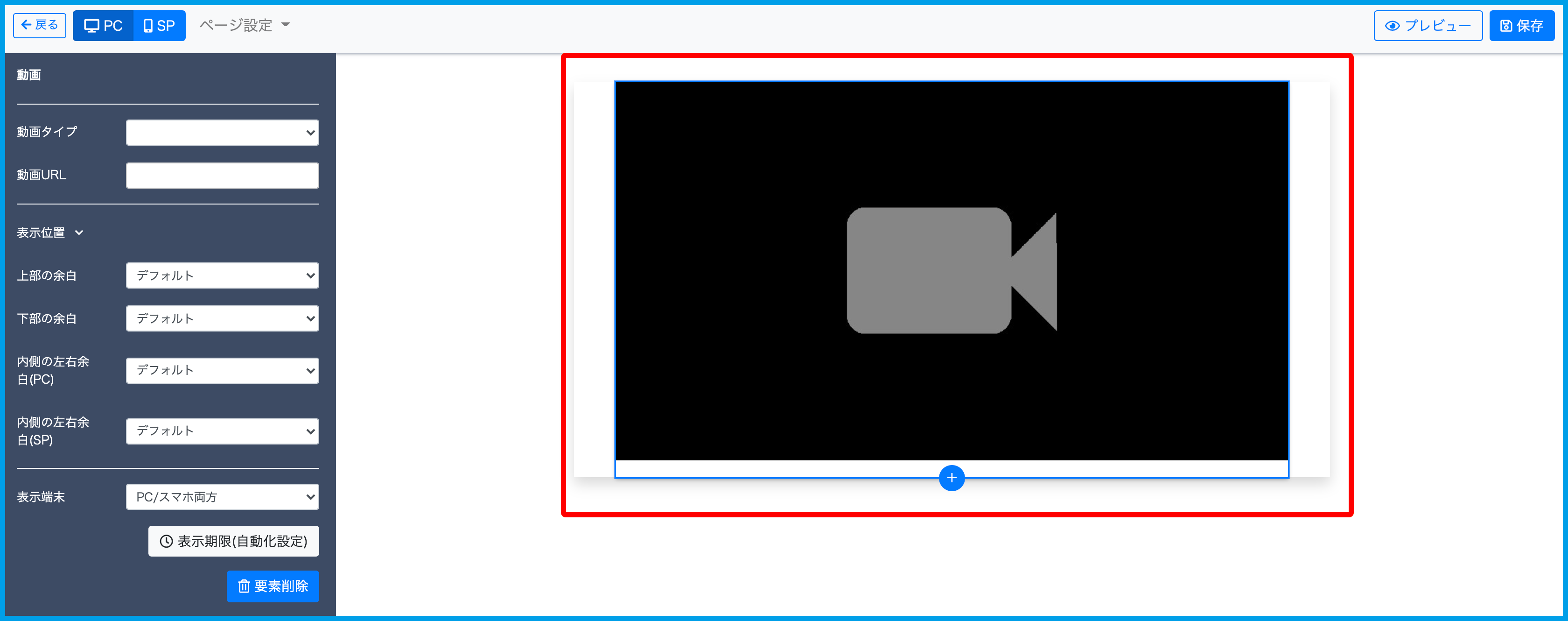 1.ページ編集画面にて「動画」を追加したい場所の【+】をクリックします。