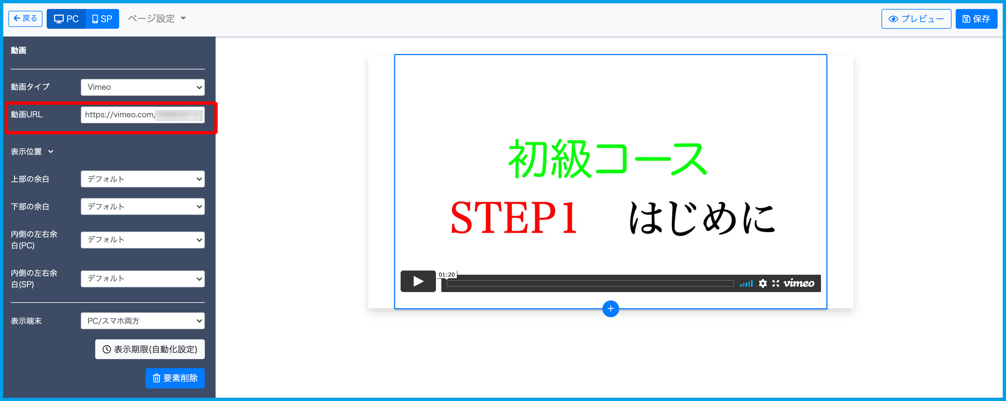 2.設定メニューの「動画URL」にリンクを貼り付け、動画が反映されたら完了となります。