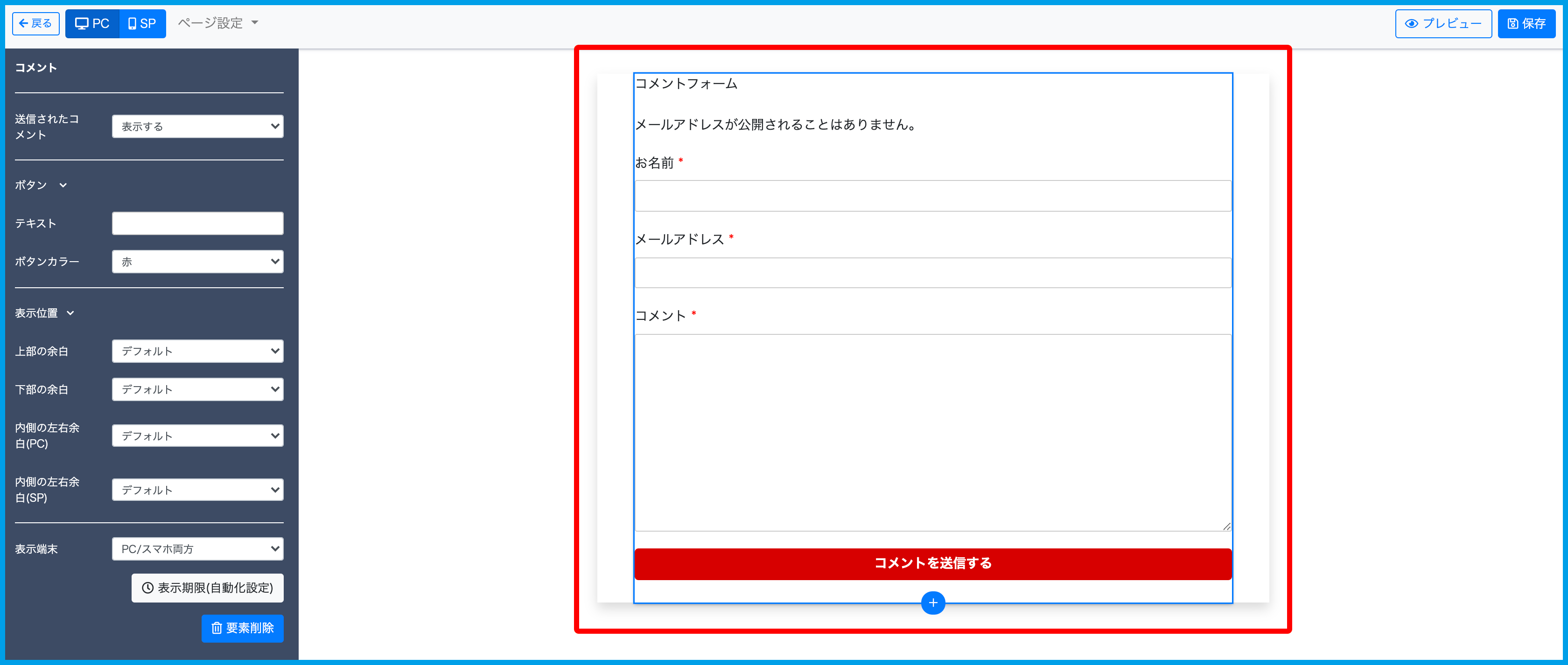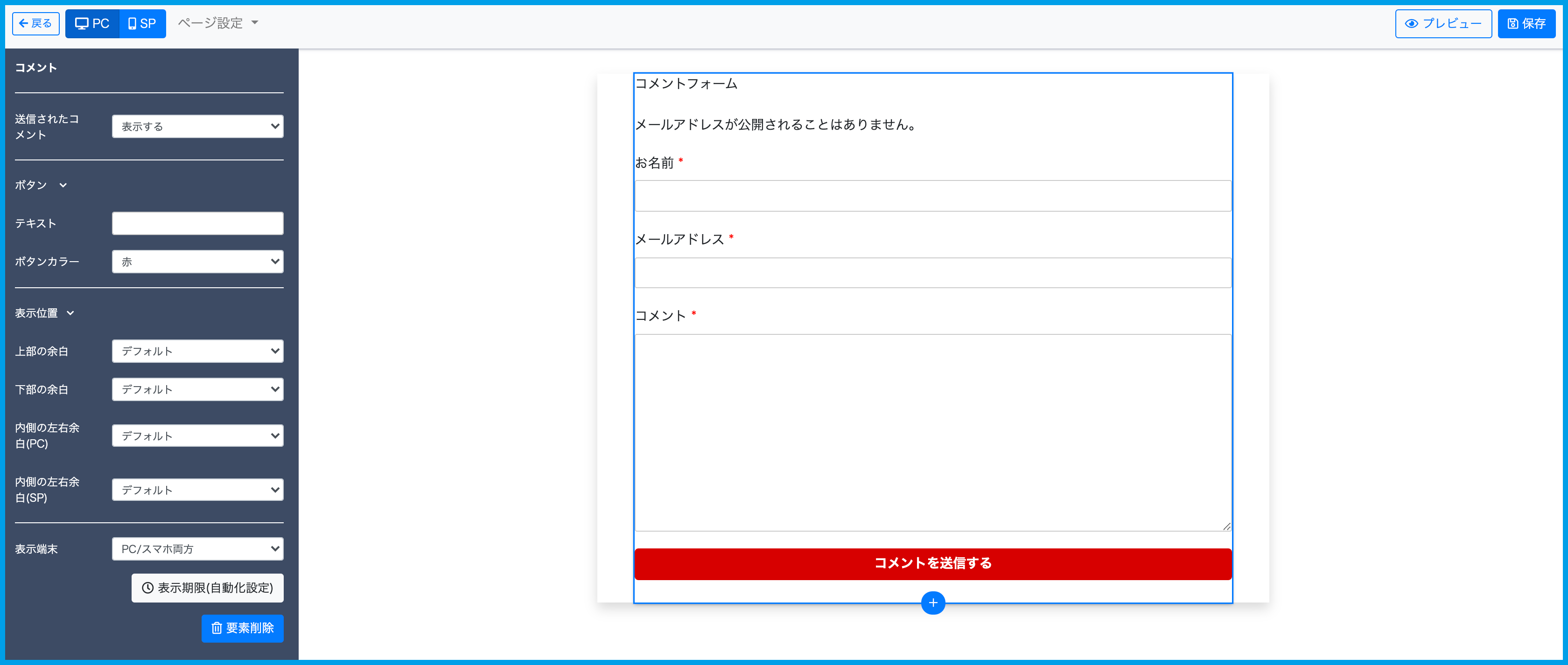 デフォルトの「お名前+メールアドレス+コメント」のほかに、「お名前+コメント」を選択できます。