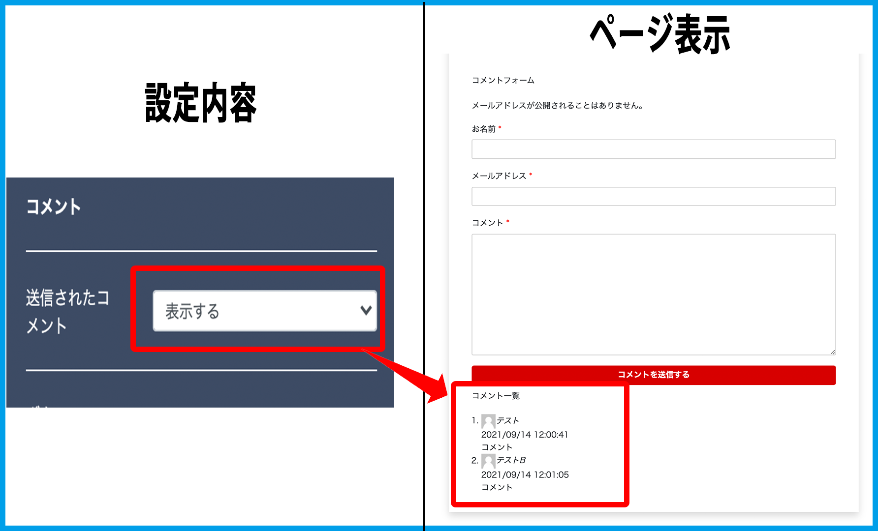 送信されたコメントを、ページのコメント欄下に表示することができます。