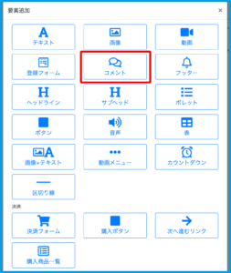 1.ページ編集画面にて「コメント」を追加したい場所の【+】をクリックします。